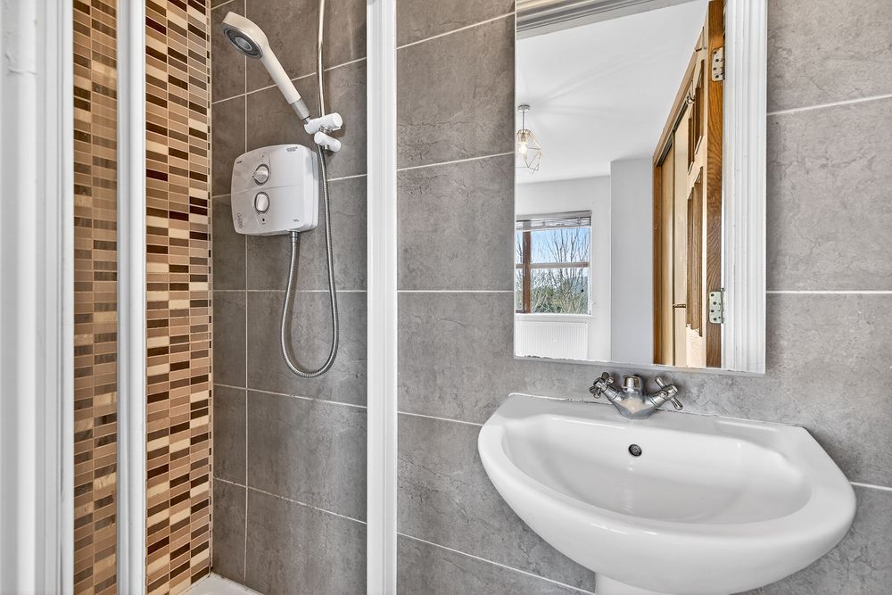 Tiled floor to ceiling, Electric shower, WC, WHB.
