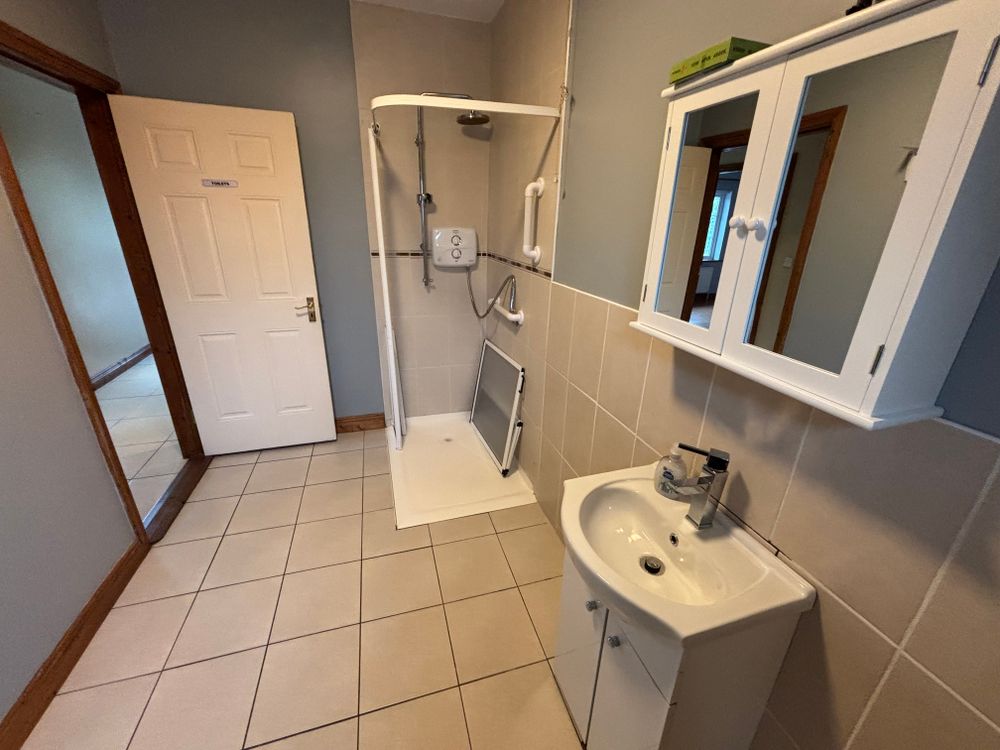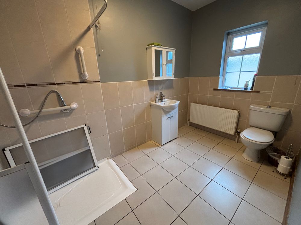A generously sized bathroom, impressively fitted out as a fully tiled wet room. Features include tiled floors, fully tiled walls, a wash hand basin, WC, and a spacious shower area equipped with a Triton T90Z shower unit.