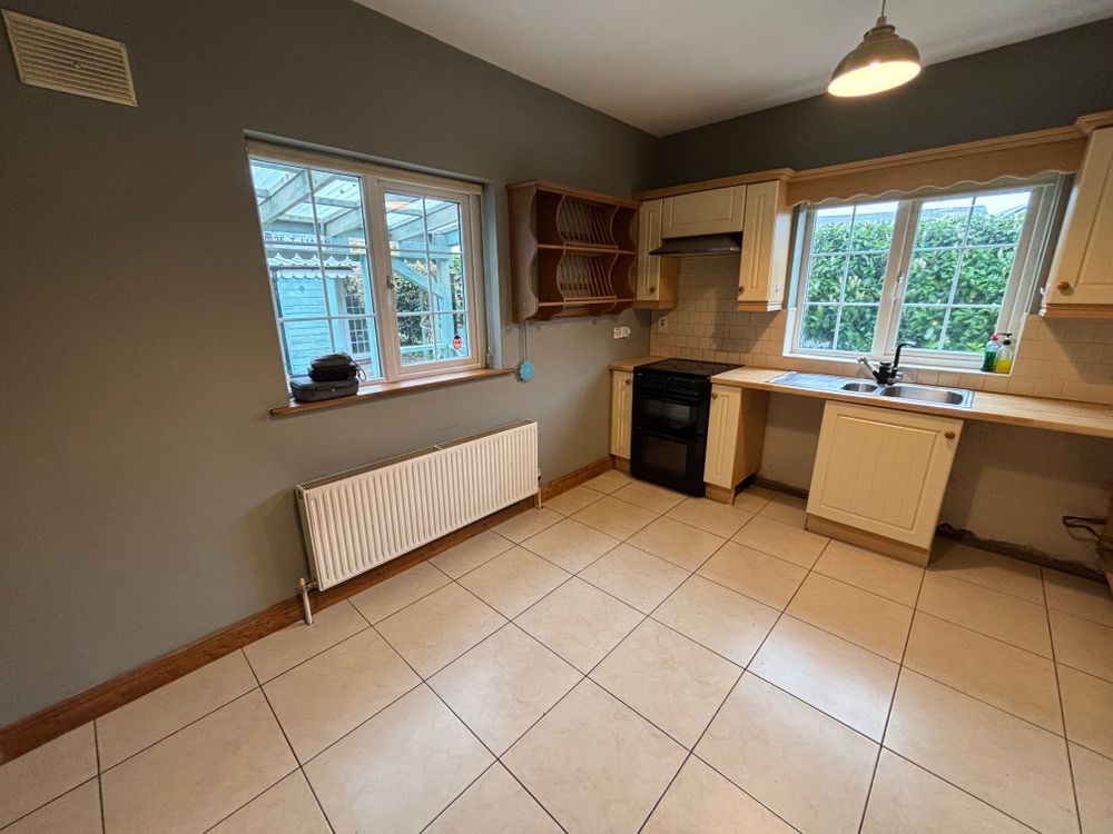 A bright kitchen and dining space with a practical tiled floor. The room features an L-shaped kitchen layout with a generous work surface area, along with a range of floor and wall-mounted presses offering ample storage. A rear door leads directly to the utility area.