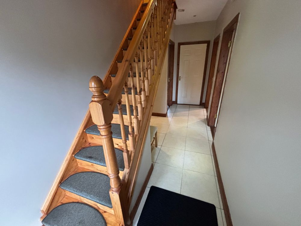 A bright and welcoming entrance hall with attractive tiled flooring. Access is via a PVC front door with glazing and a glazed side panel, allowing generous natural light into the space. An alarm system is fitted, providing additional security. A large hot press is also located off the hall.