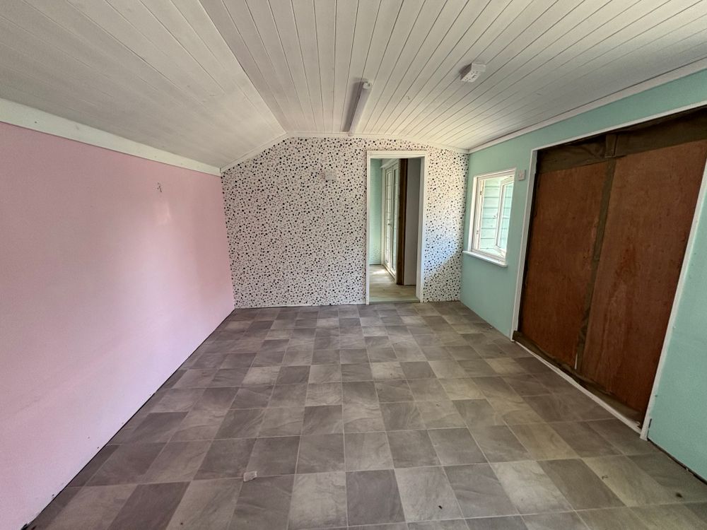 A spacious and characterful room on the first floor, currently used as a bedroom. Features include a carpeted floor, an attractive timber ceiling, and a Velux skylight window which floods the room with natural light. Additional storage is available in the eaves.