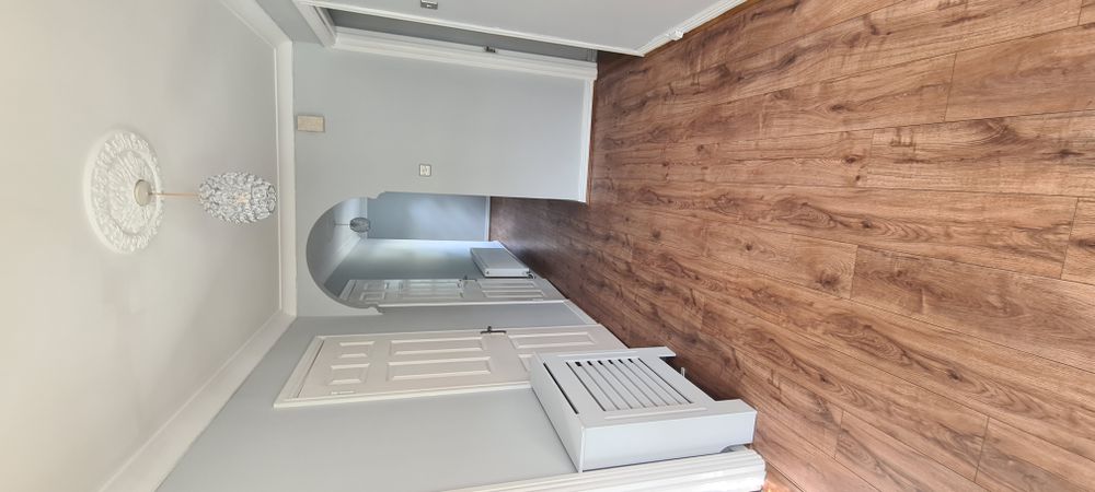 Spacious entrance hallway with laminated flooring, electric storage heater, radiator, power and phone points, door leading to sitting room on the left hand side, storage press for coats etc, Airing cupboard which is shelved. Door through to kitchen on the right hand side.