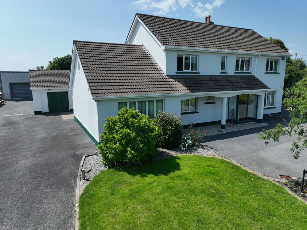 New to the market this impressive stylish two storey detached five bedroom home situated in a highly convenient location within 15 minutes of Sligo city centre while also boasting all the privacy and tranquillity of a countryside setting. The accommodation comprises of a welcoming entrance hallway, spacious sitting room with solid fuel fireplace, kitchen dining with extensive range of fitted units and solid fuel stove with back boiler, utility room, office and storage room five double bedrooms, master en-suite, bathroom, wc and landing with large hotpress and access to the floored attic. Externally the property enjoys extensive private grounds with mature hedging, beautiful trees and tarmac driveway with ample car parking around the house together with three large garages. The property also has a very impressive B3 energy rating which qualifies for the green mortgage rates. With its unique combination of countryside surrounds and proximity to the N17 and N4 this is certainly one not to be missed. Full details and viewings strictly by request.