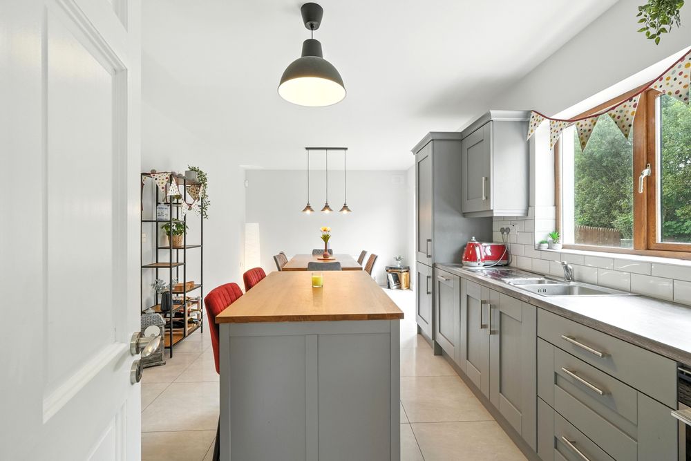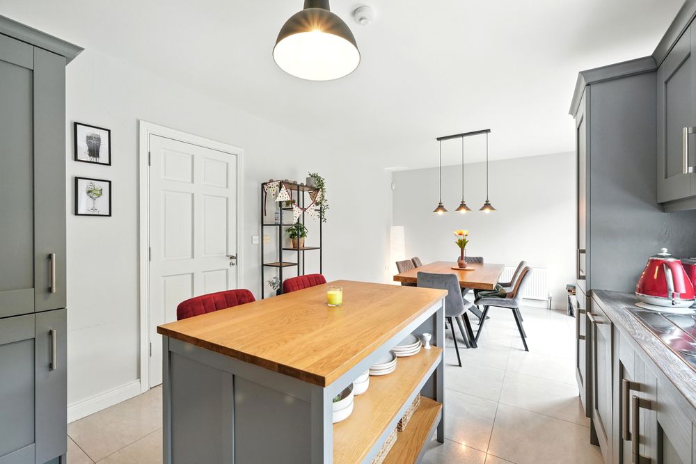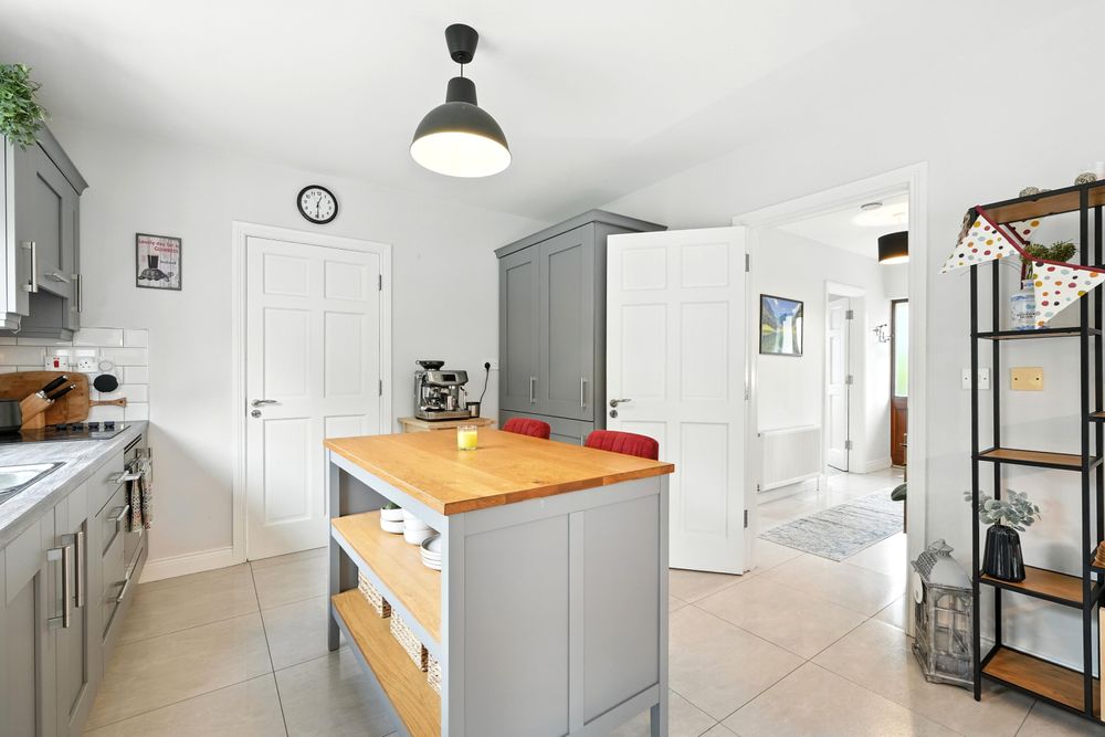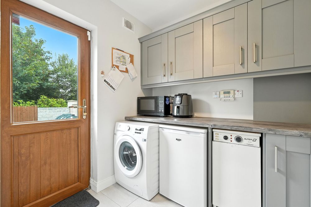Finished with tiled flooring, fully fitted units, and houses the oil fired central heating. Downstairs WC off and door off to the back yard.