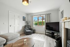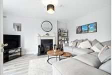 A bright spacious room, finished with laminate wood flooring and has an open fireplace with a fitted insert stove.