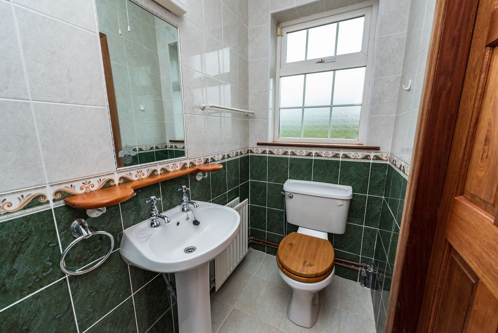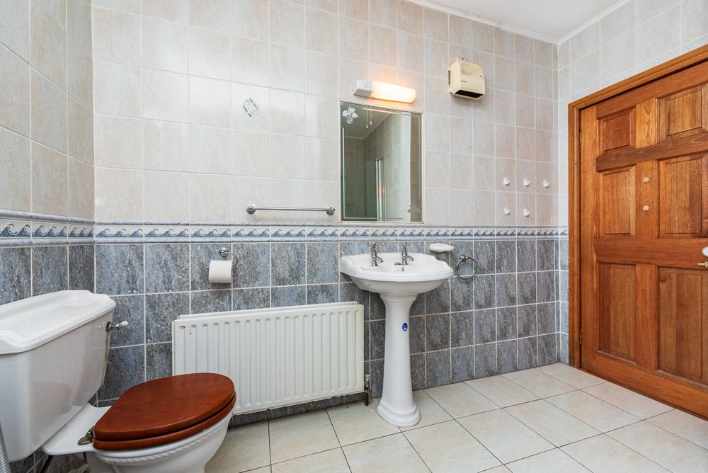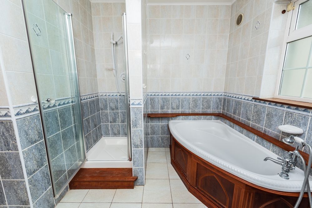 w.c., w.h.b., corner bath with shower attachment, separate shower, fully tiled floor and walls