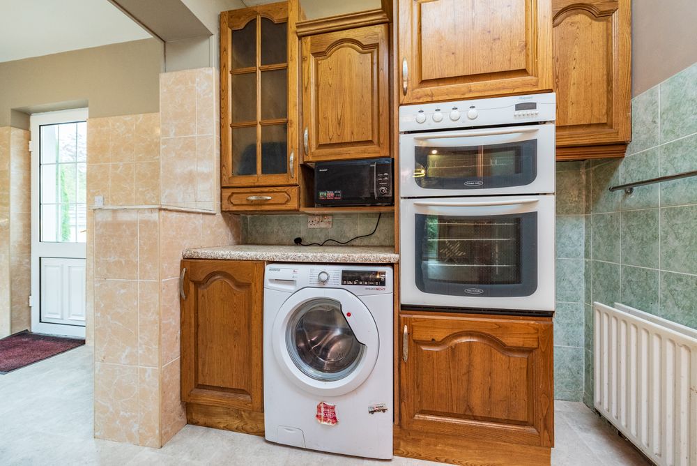 Built-in ground and eye level units, stainless steel sink, tiled splash back, Belling hob, extractor.