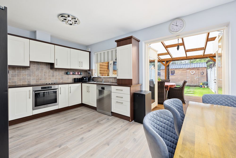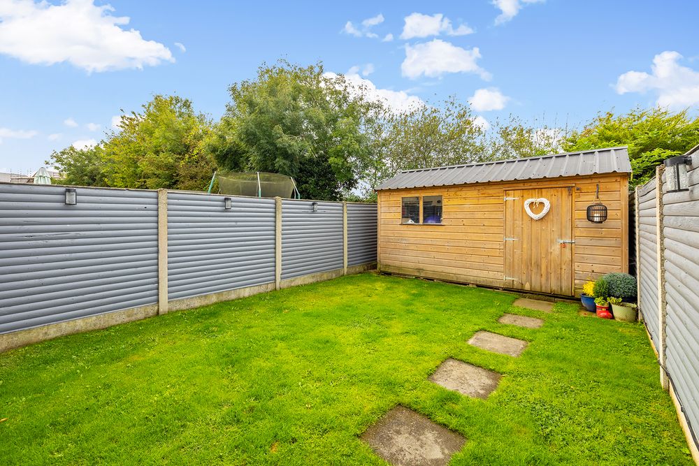 The accommodation is bright, spacious and thoughtfully designed. The entrance hallway features a guest W.C, while the living room offers a comfortable and welcoming space with double doors leading through to a light-filled open plan kitchen and dining area. From here, doors open to a fantastic covered pergola with electric points - creating a seamless indoor-outdoor space - a perfect spot for relaxing or entertaining all year round. The sunny, south-facing rear garden is laid in lawn and includes a timber storage shed.