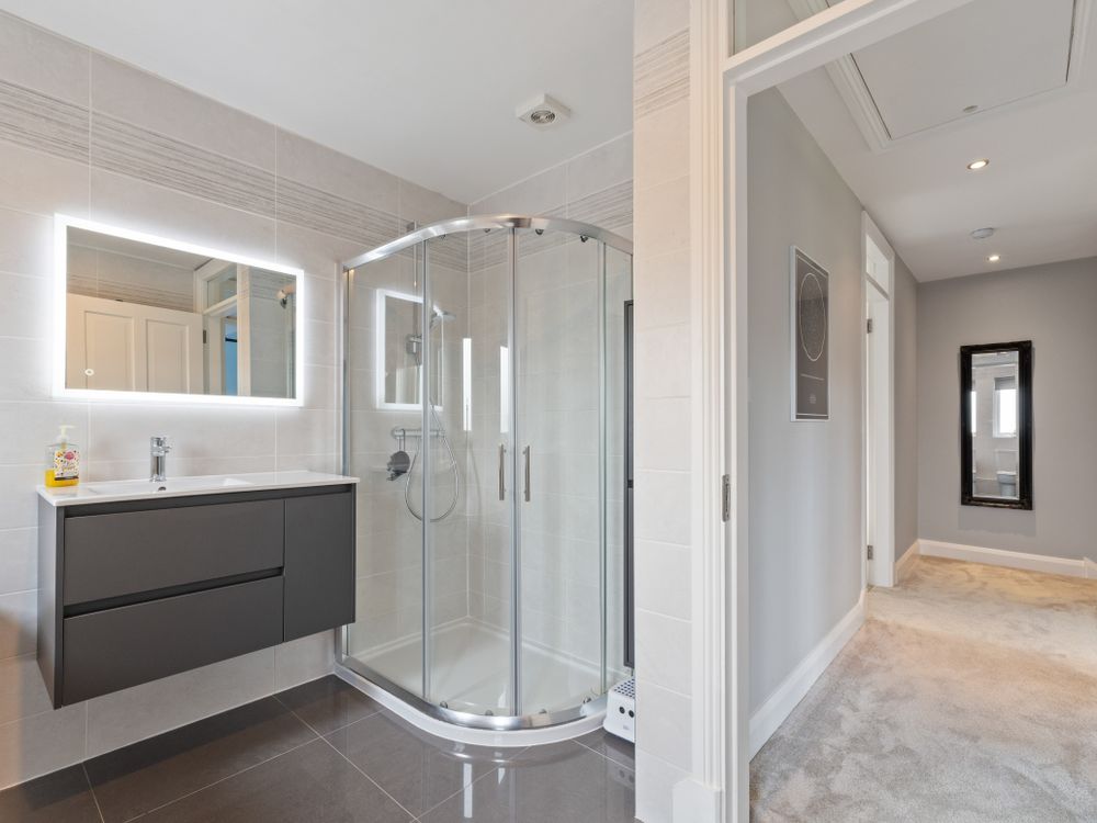 Fully tiled. Includes WC, bath, corner shower with fitted shelving, double WHB with vanity unit complete with mirror over and large heated towel rail. This room has a truly wonderful finish throughout. The en suite has the additional benefit of underfloor electric heating throughout.