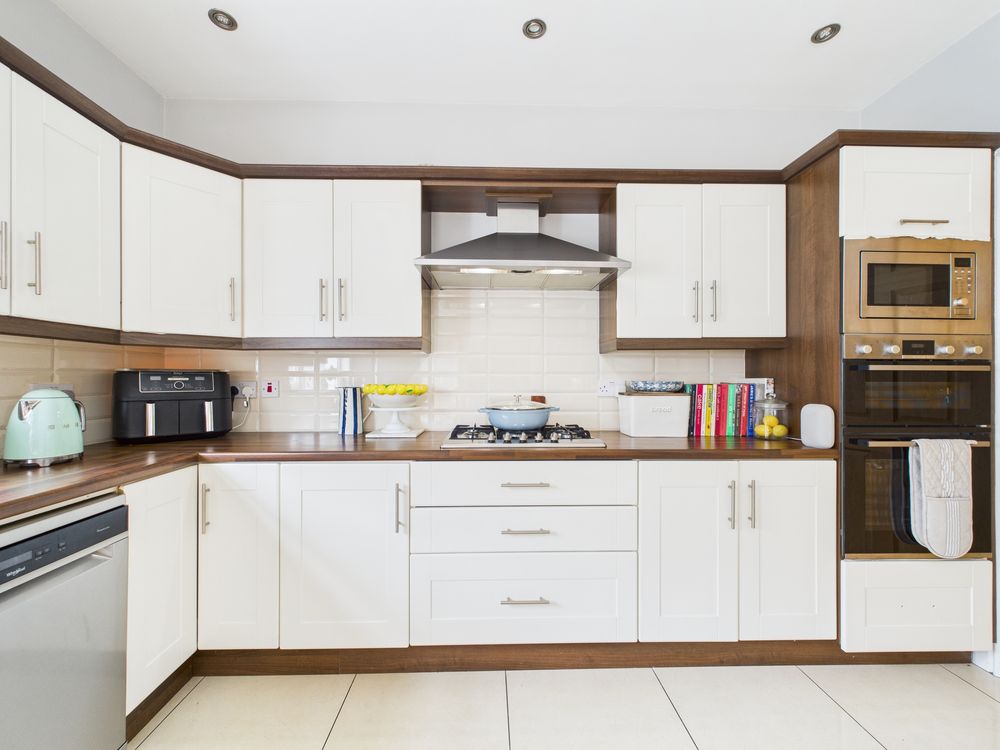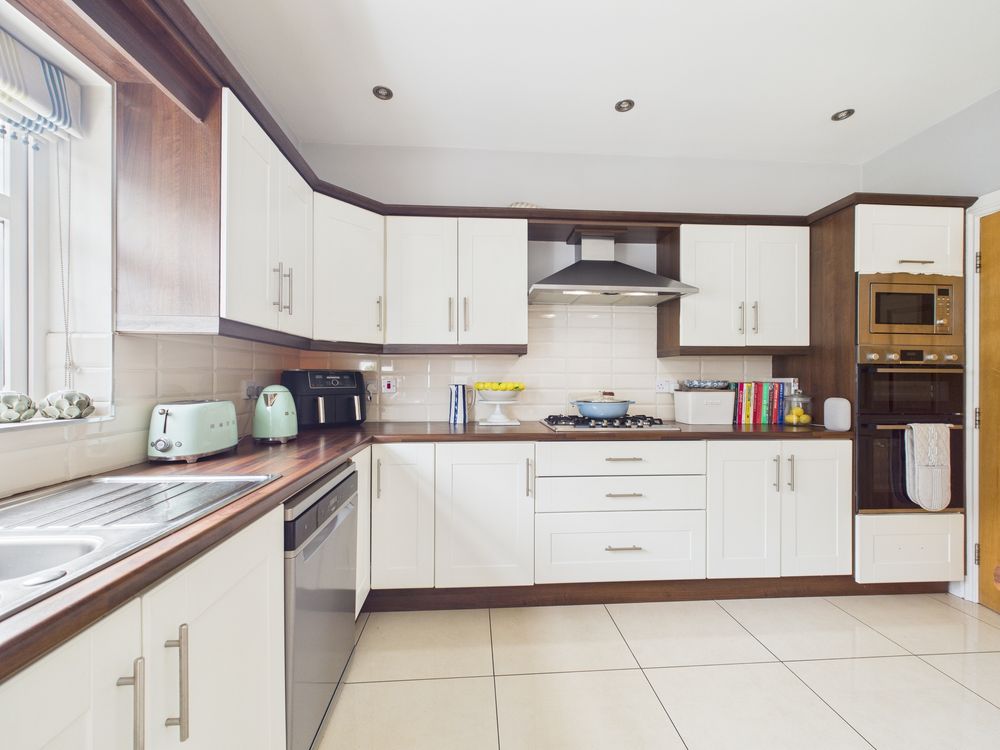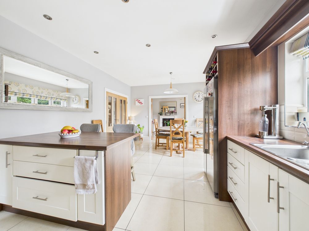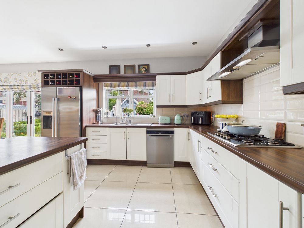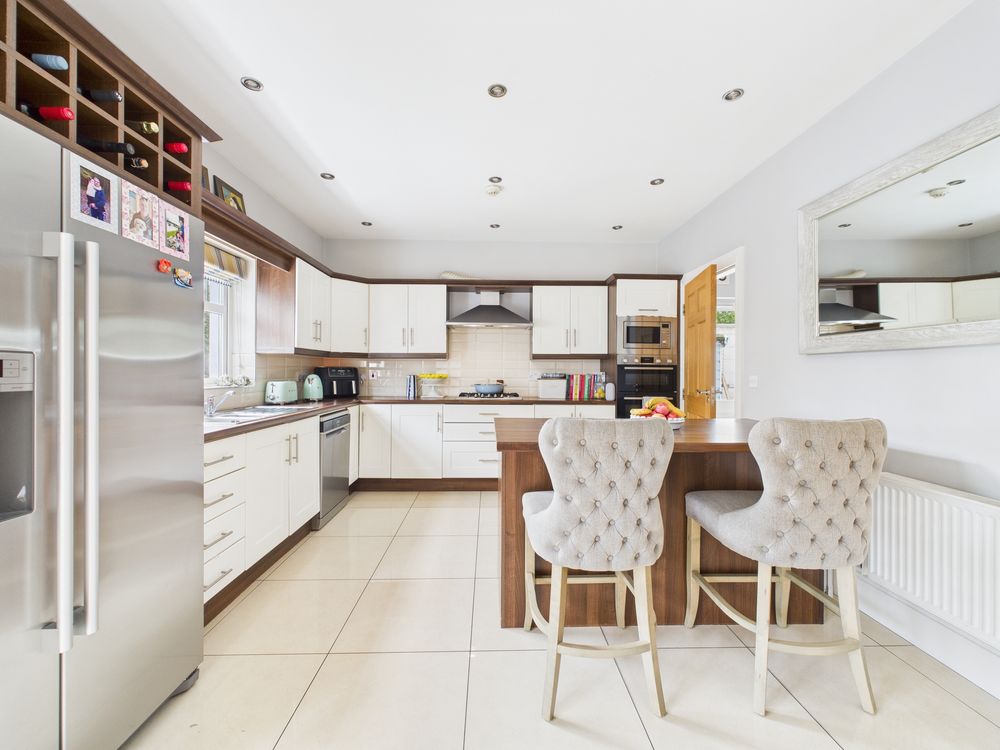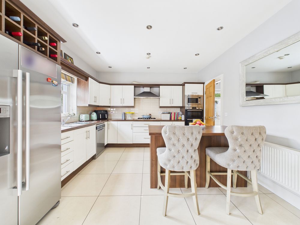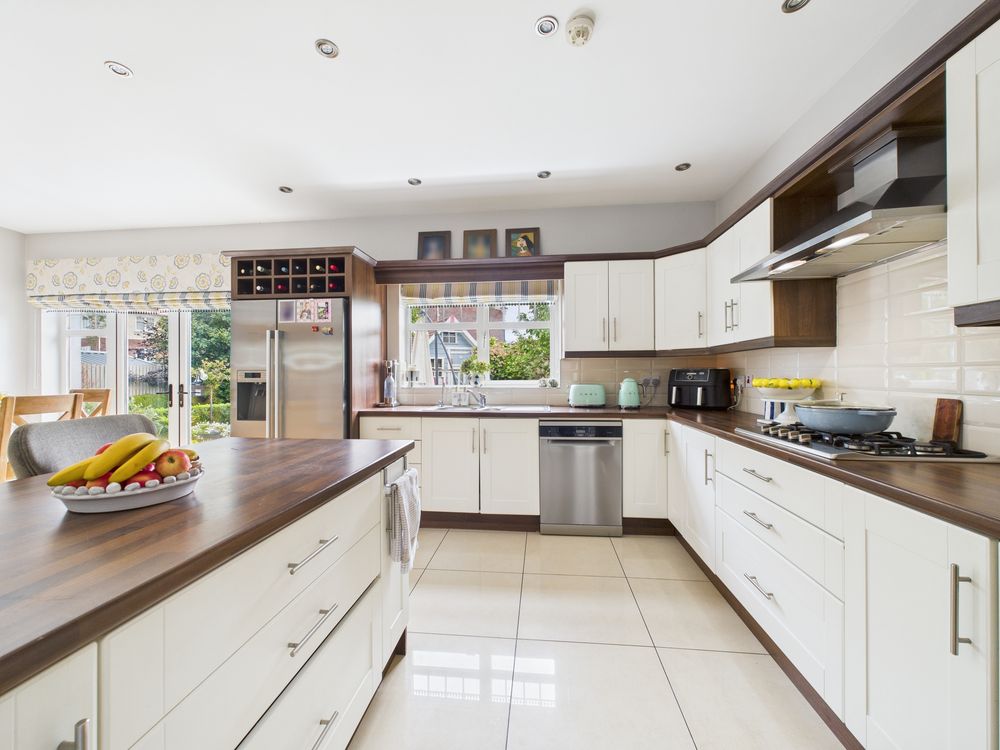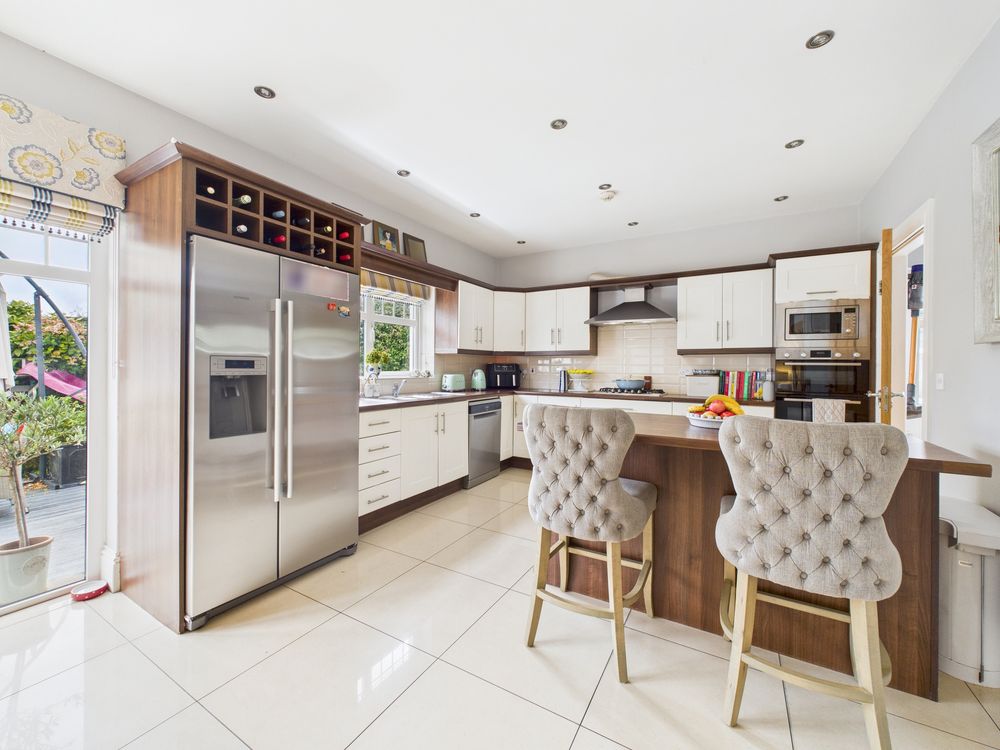 The modern kitchen boasts sleek white cabinetry with contrasting wood accents, complemented by polished tiled flooring and spotlit ceilings that create a bright, airy atmosphere. High-quality integrated appliances ensure this space is as functional as it is attractive. A central island with breakfast bar seating provides additional storage and a relaxed dining option, ideal for busy family mornings or entertaining guests.