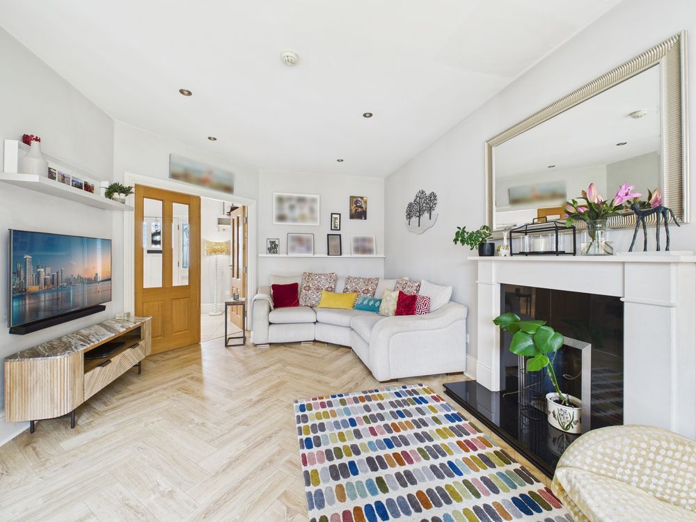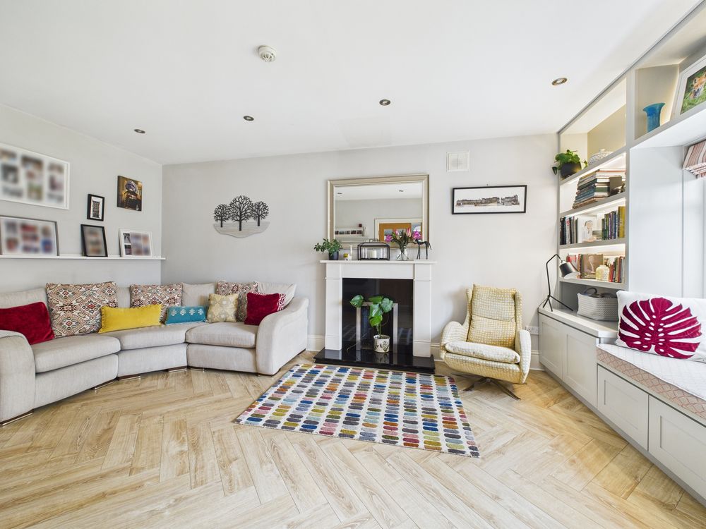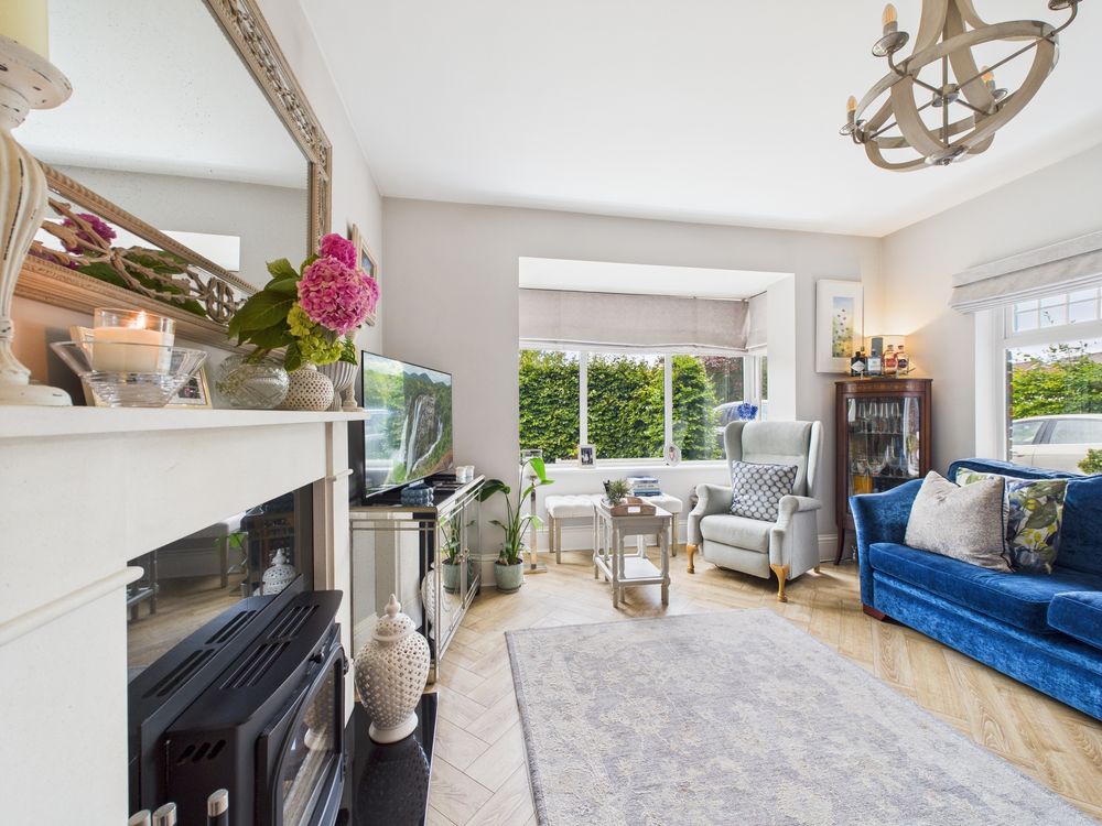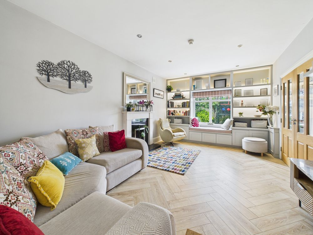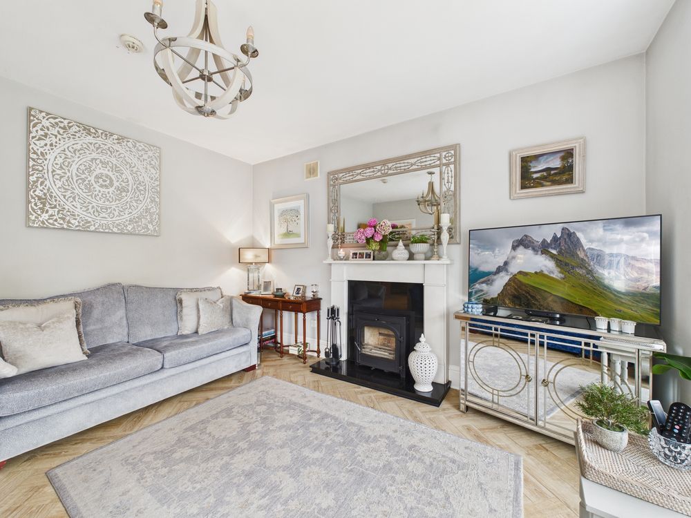 Off the hall is the first of two reception rooms. This beautiful, bright and spacious room enjoys gorgeous morning light, which truly shows the exquisite décor. With herringbone floors, inset stove and a bay window, everything is just perfect.