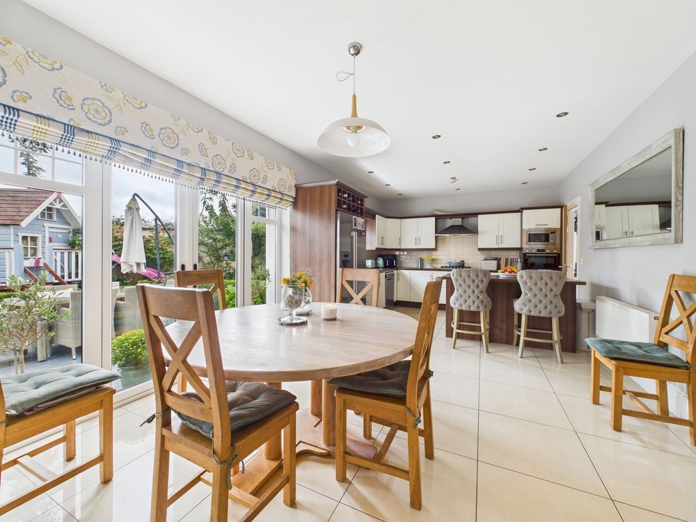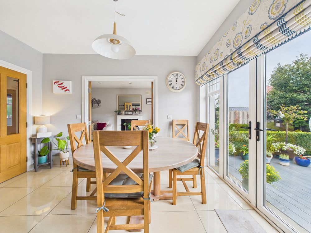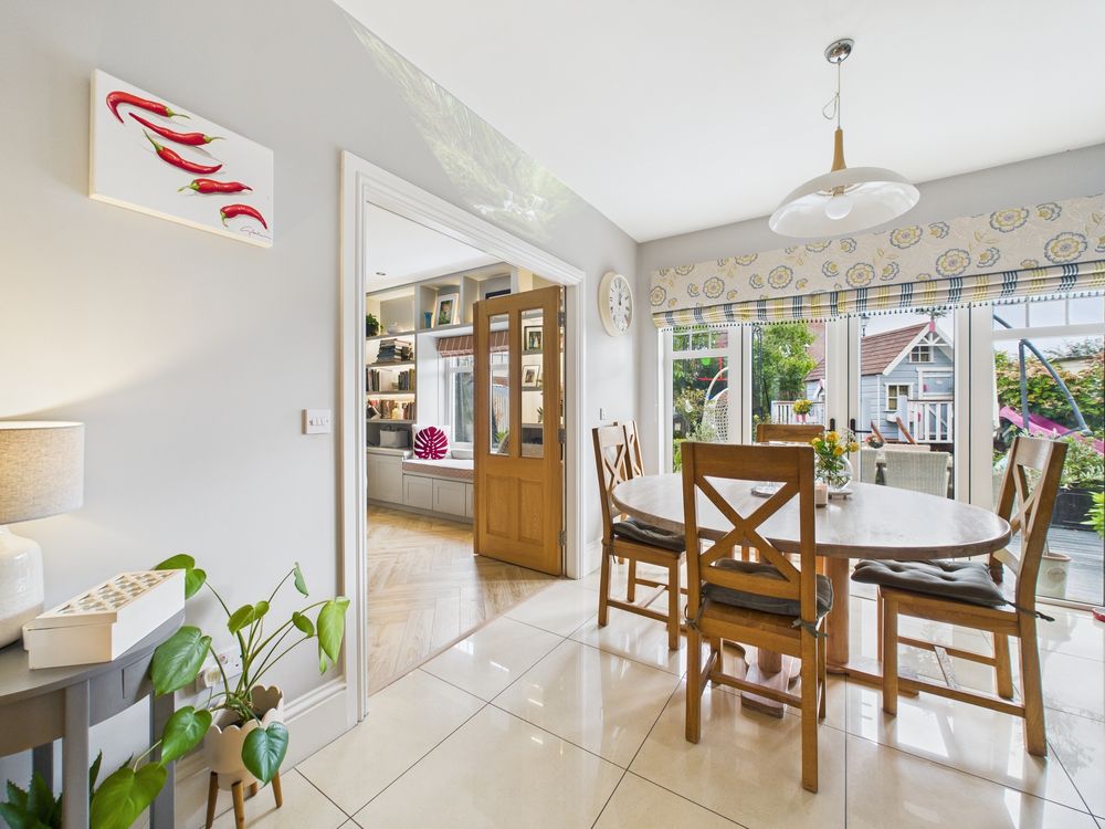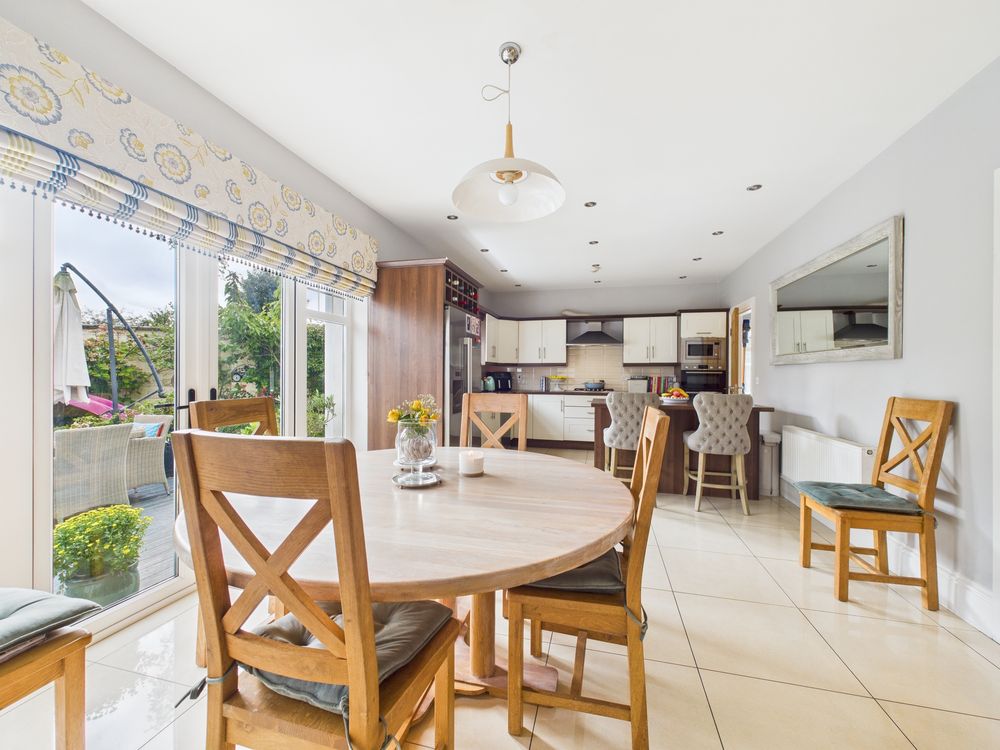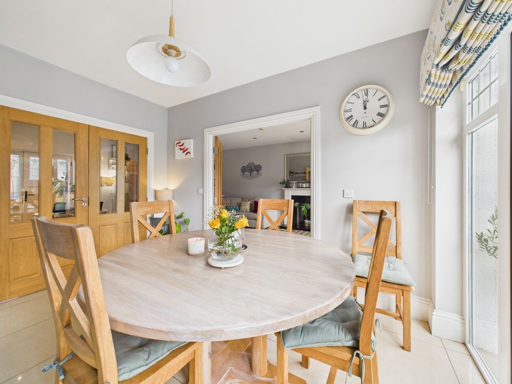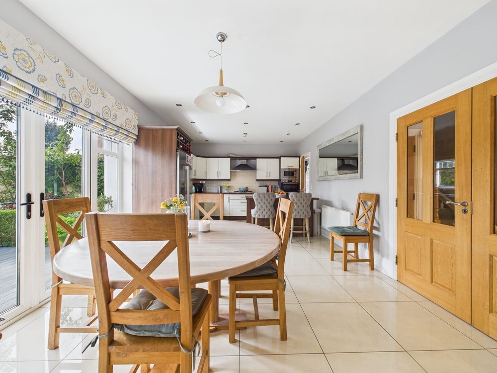 Flowing seamlessly from the kitchen, the spacious dining area features French doors, opening onto the garden and inviting plenty of natural light. With direct access to the outdoor patio and garden, this open-plan layout is perfect for both everyday living and hosting gatherings, making it a true highlight of the property.