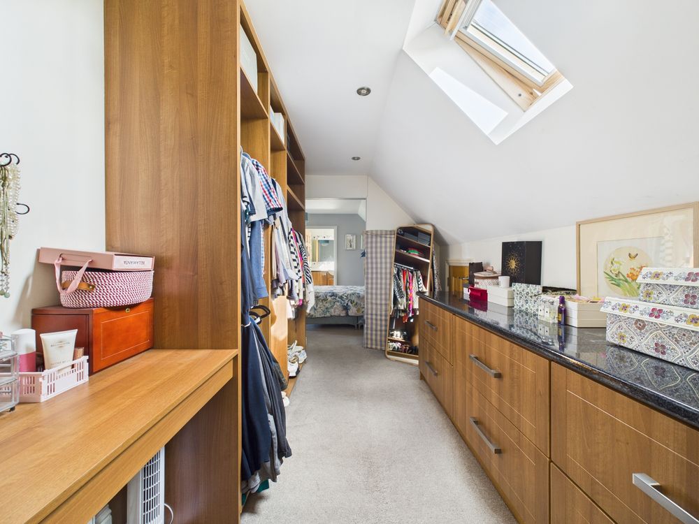 Adjacent to the bedroom is a spacious dressing room with extensive built-in storage and a sleek countertop, ideal for organisation. Beyond this lies a separate walk-in wardrobe, providing excellent additional storage space.
