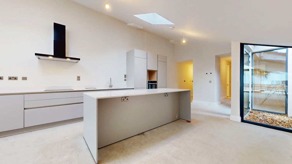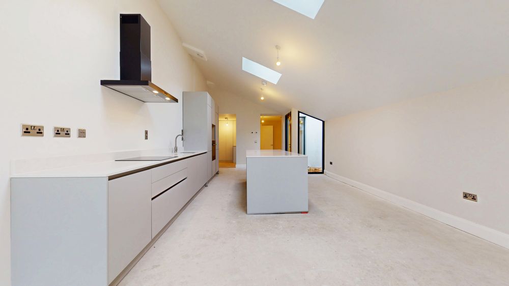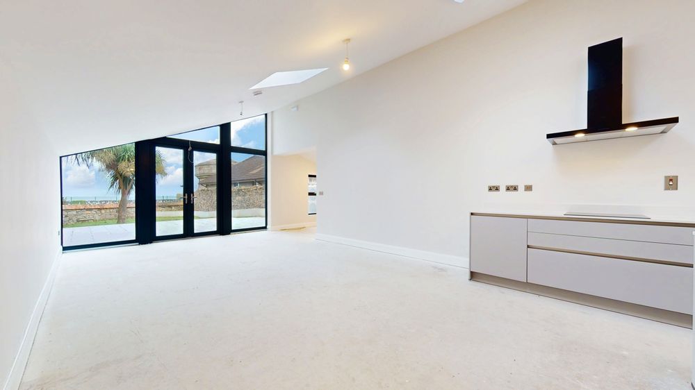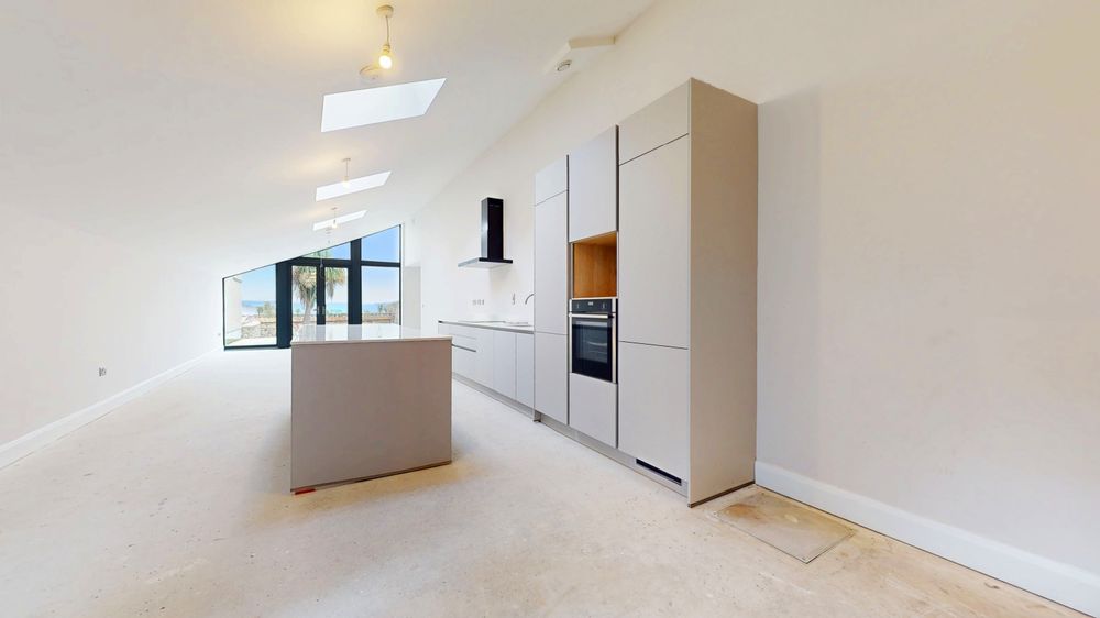 The ground floor offers a large double bedroom close to the entrance and an impressive open - plan layout that flows seamlessly to the spacious rear garden, where stunning sea views can be enjoyed. The kitchen and living area feature soaring high ceilings and a brand - new Kube Kitchen, combining contemporary design with everyday functionality. A well-appointed utility room provides additional storage with new cabinetry and fixtures. The electrical specification is equally impressive, with Cat - 6 cabling and chrome switches and sockets fitted throughout.