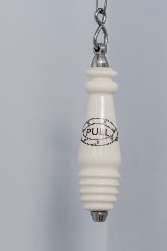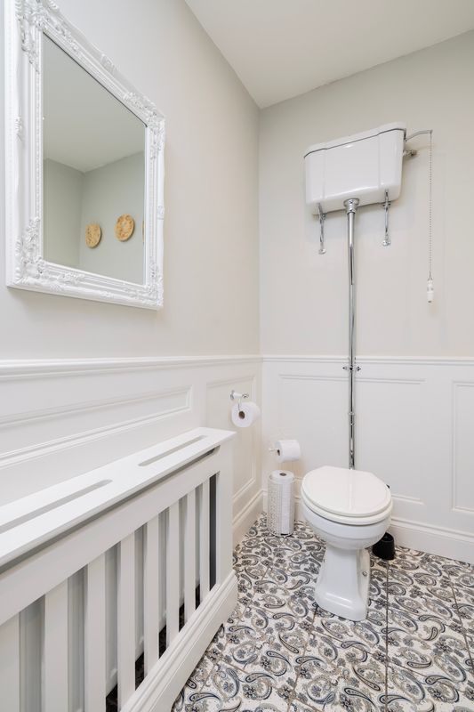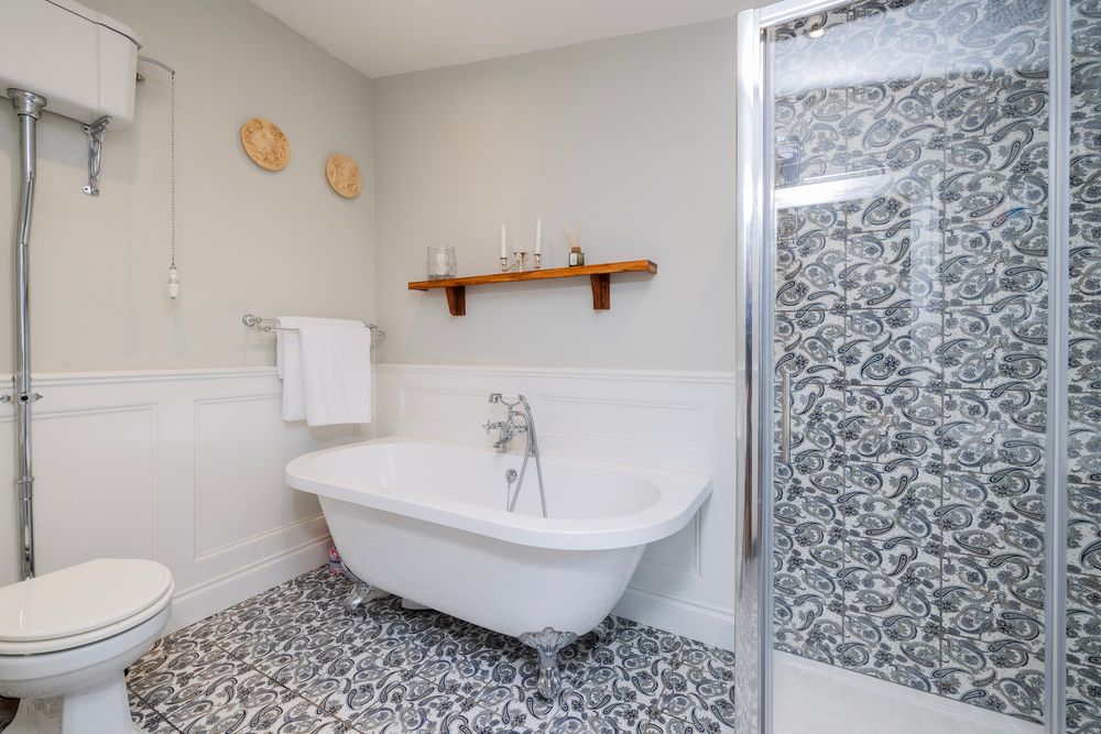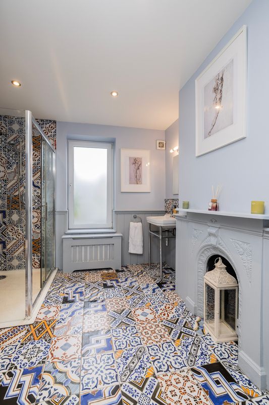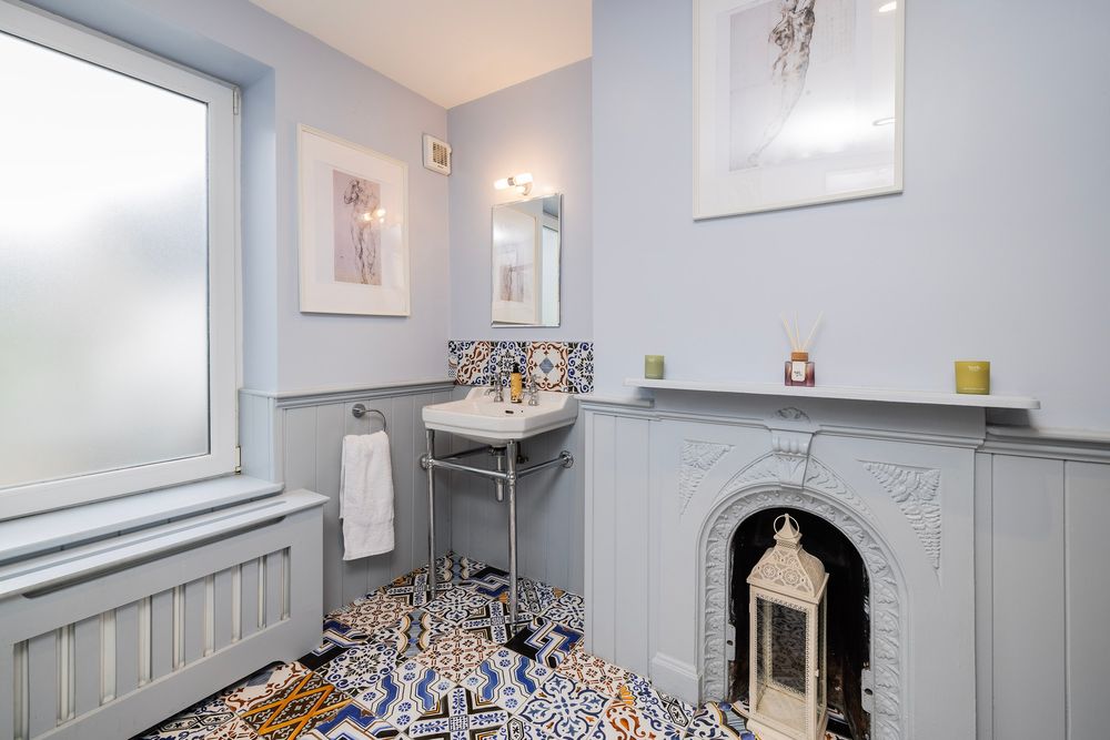 The first of the two bathrooms is down a few steps off the hallway. It features a high wall-mounted cistern toilet, a large shower with a traditional sink, an original cast-iron fireplace, and wall panelling with a bespoke cabinet.