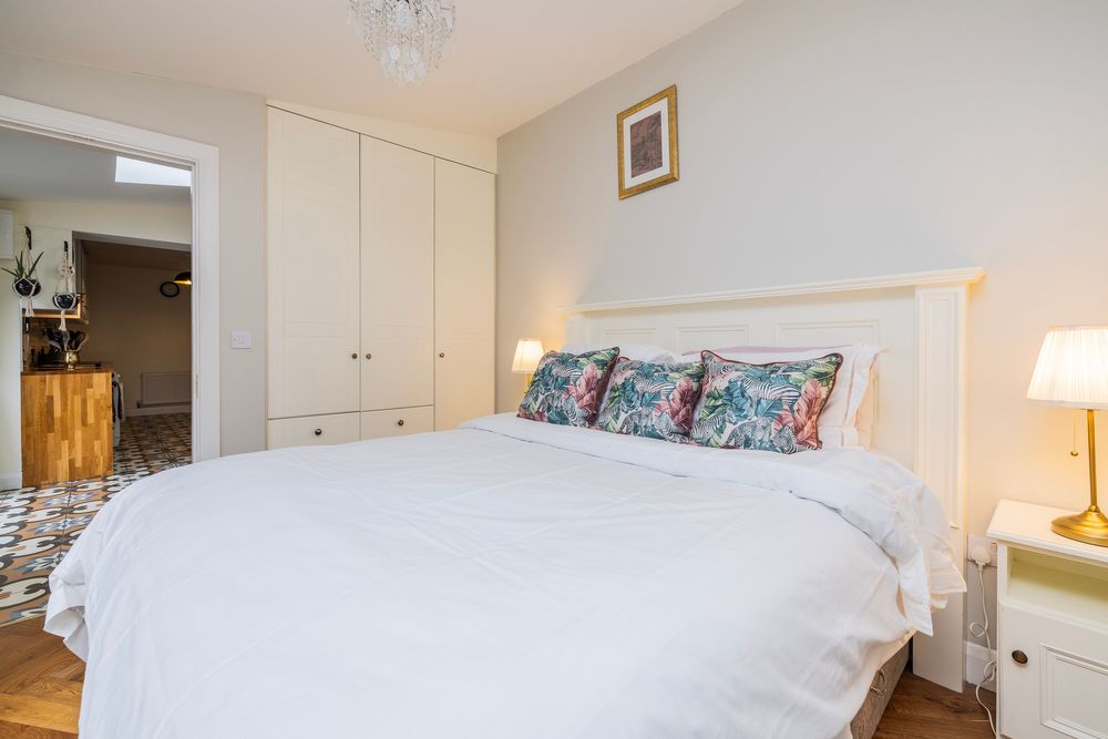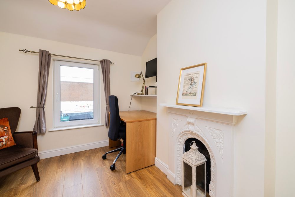Upstairs are two further bedrooms, each with original cast-iron fireplaces and fitted wardrobes, adding to the home's rich history. The rooms are flooded with natural light, creating a bright and inviting space. The blend of modern and historic elements comes together seamlessly, adding layers of personality to this home.