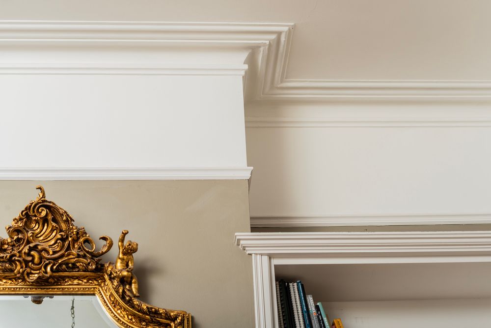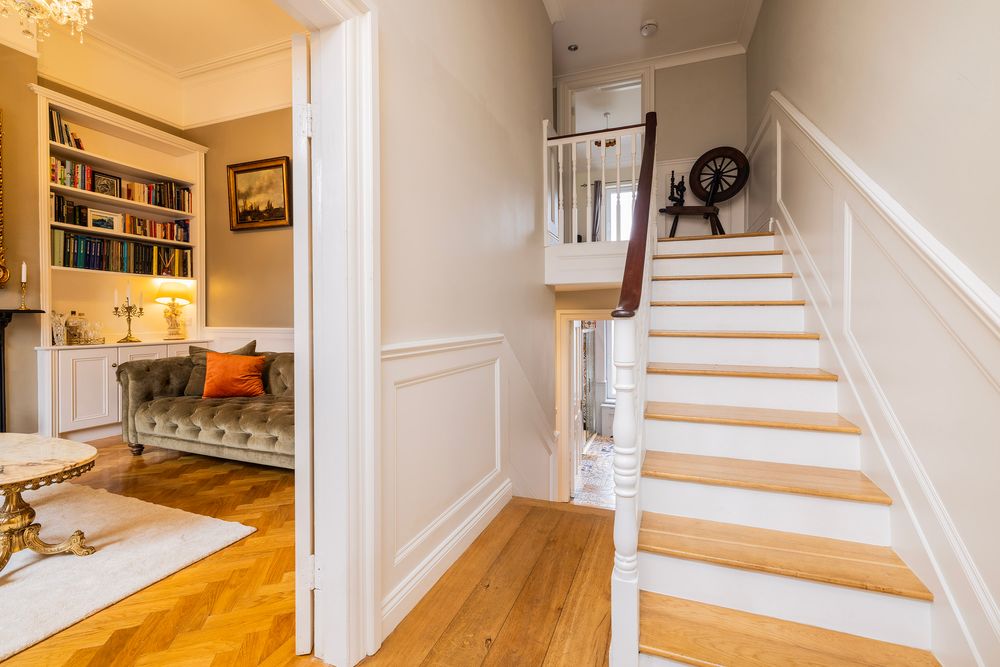 To the left, the impressive living room boasts 13.5ft ceilings, coving, wall panelling, radiator covers, bespoke bookshelves with a Henley insert stove creating a bright and welcoming space perfect for relaxing or entertaining.