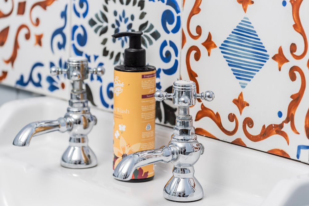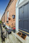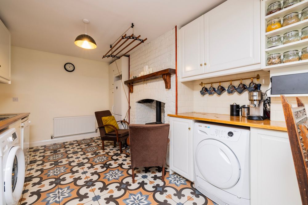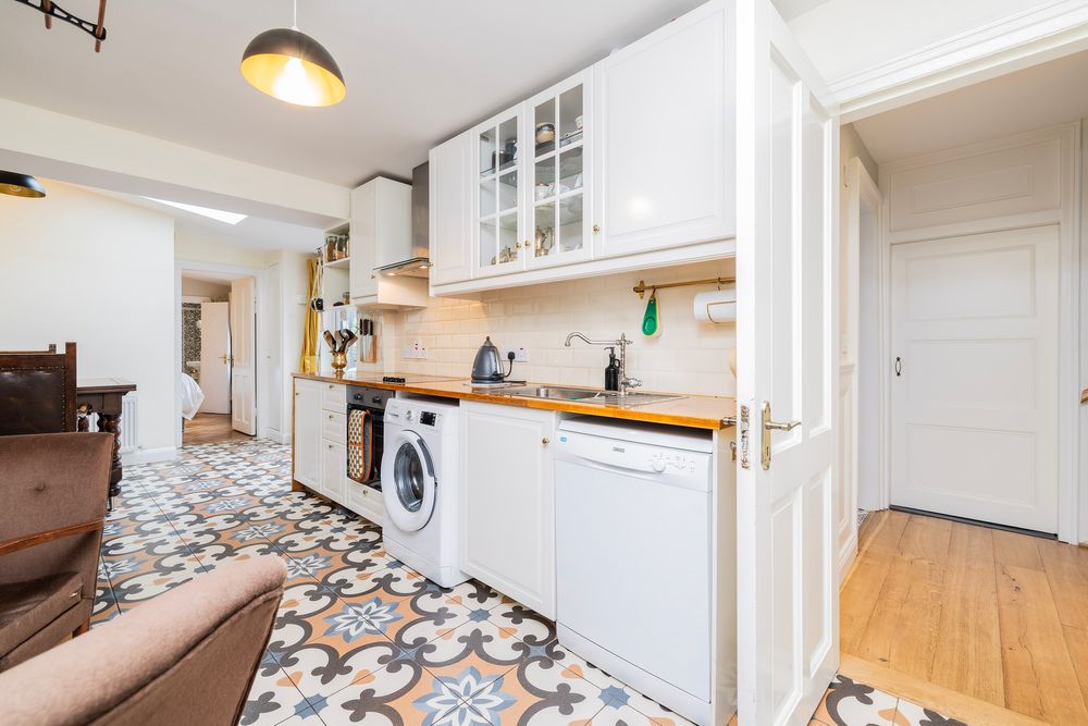 There is a traditional kitchen with a restored brick fireplace, featuring a spalted beech mantel and a Stanley stove that captures your attention on entering. French doors open out to a south-facing private courtyard, paved for easy maintenance and providing extra storage. Beyond the kitchen lies a spacious double bedroom with fitted wardrobes and a linen cupboard. This bedroom also benefits from a large ensuite bathroom, boasting yet another high-cistern toilet, a free-standing bath, a rainwater shower, large sink inspired by the Victorian era and an elegant wall panelling that enhances the period charm.