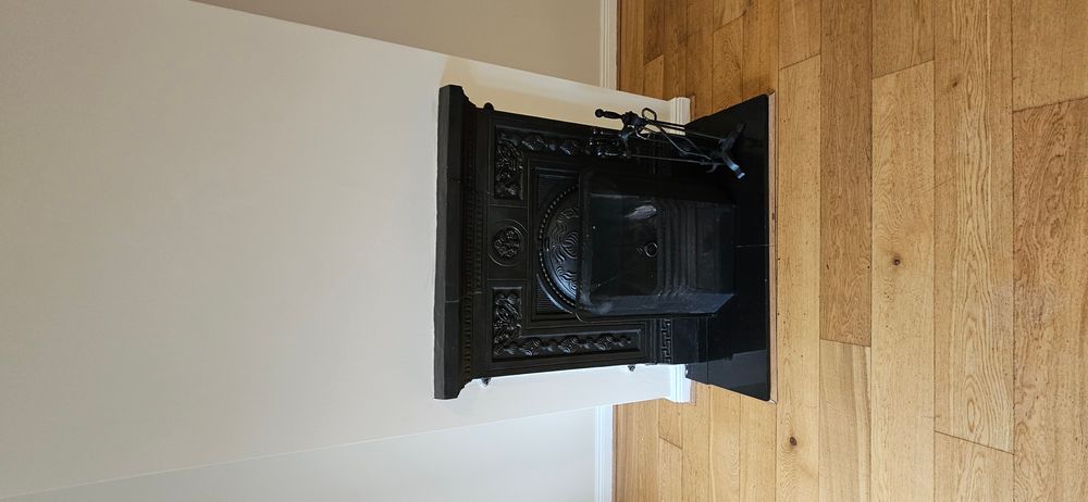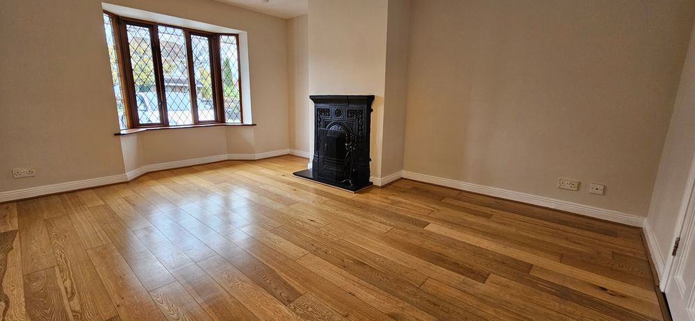 Oak flooring, bay window, radiator, open fire with cast iron fireplace and granite hearth, power points, tv point, double doors to kitchen/dining room.