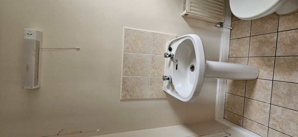 Tiled floor, bath with electric shower over and shower mixer and tiled surround, wc, whb, radiator, shaving light and socket.