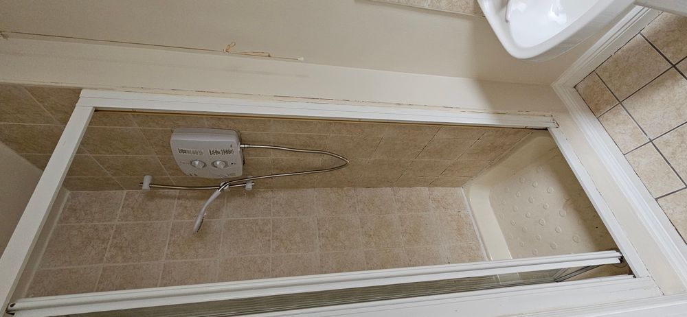 Tiled floor, wc, whb, tiled shower cubicle with electric shower, radiator, extractor fan, shaving light and socket.