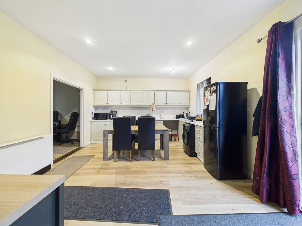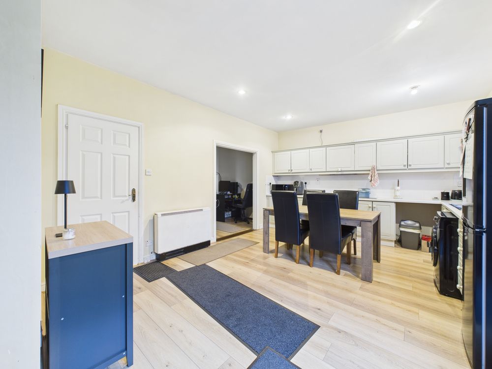 The kitchen dining room is bright and spacious and enjoys extensive fitted units and a large storage cupboard.