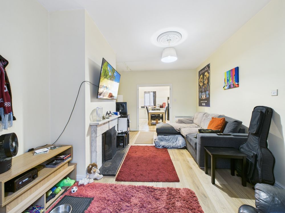 Sitting room: 5.4m x 3.265m Timber floor, fitted curtains, feature marble fireplace, double doors to kitchen/dining room.