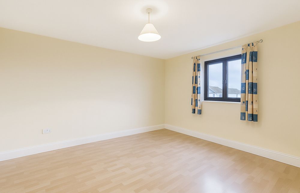 Bedroom: 4m x 3.596m Timer floor, fitted curtains, light fitting.