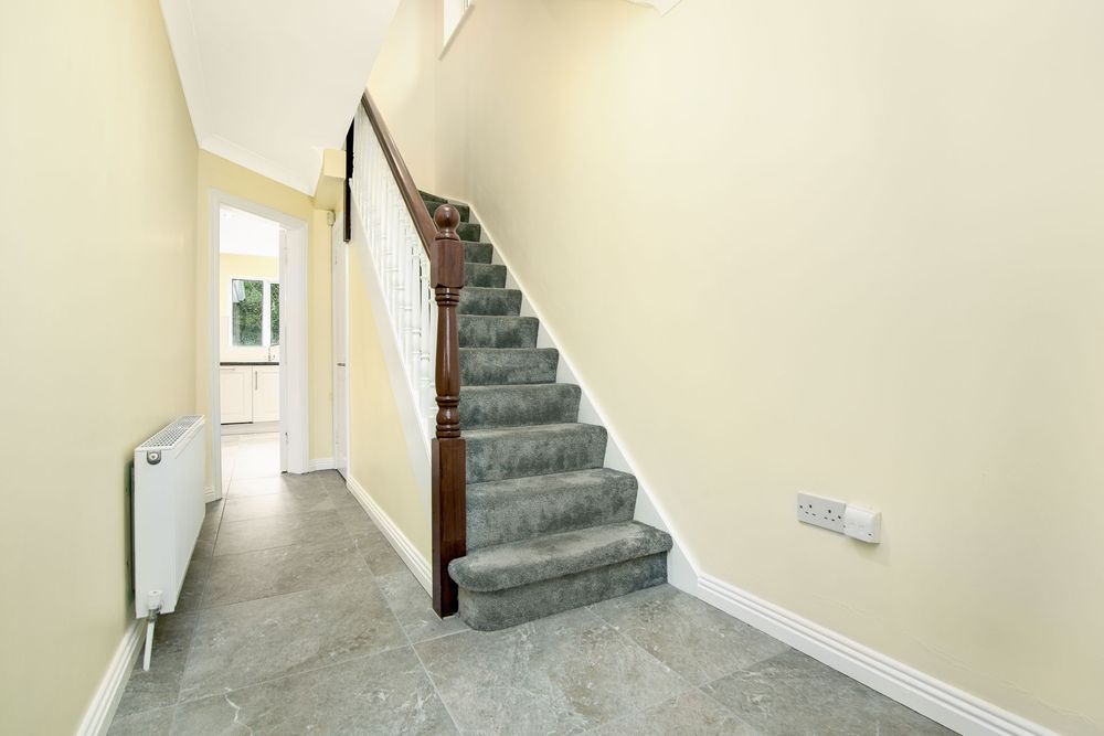 Tiled flooring. Stained glass front door. Wood staircase with carpet.