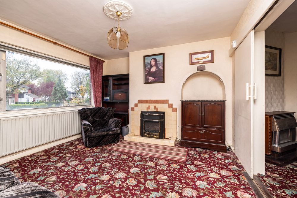 Reception room with an Art Deco open fireplace and sliding doors to the dining room.