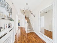 The spacious ground floor features a bright entrance hall, an elegant front living room with timber floors, and a spectacular open-plan kitchen/living/dining area. With a large central island, bespoke cabinetry, quality appliances, and French doors opening to the rear garden, this space forms the heart of the home. A guest WC and an integrated garage—ideal for storage, a home gym, or potential conversion—complete the ground level.