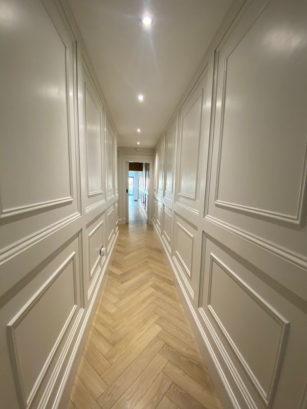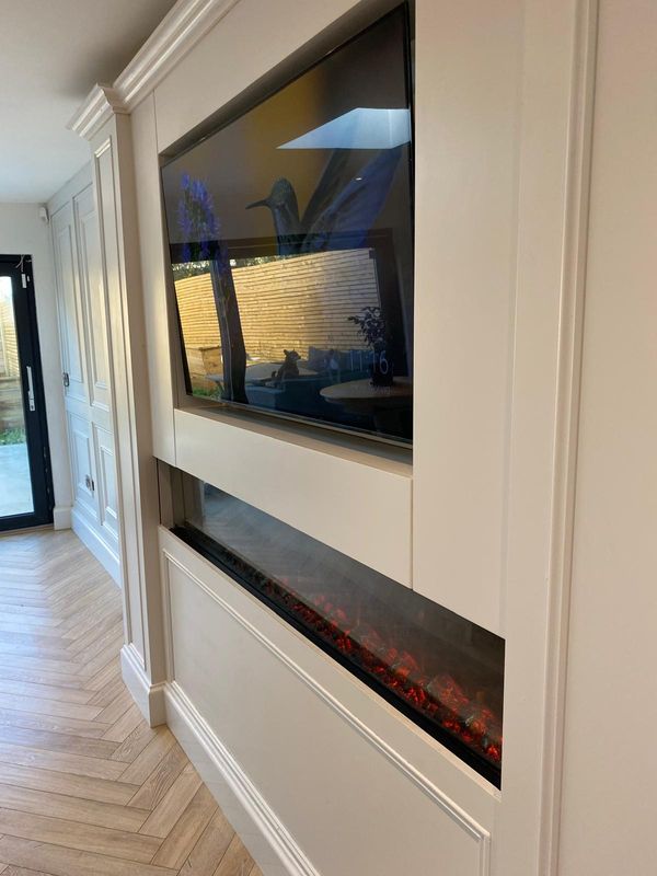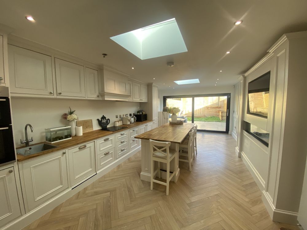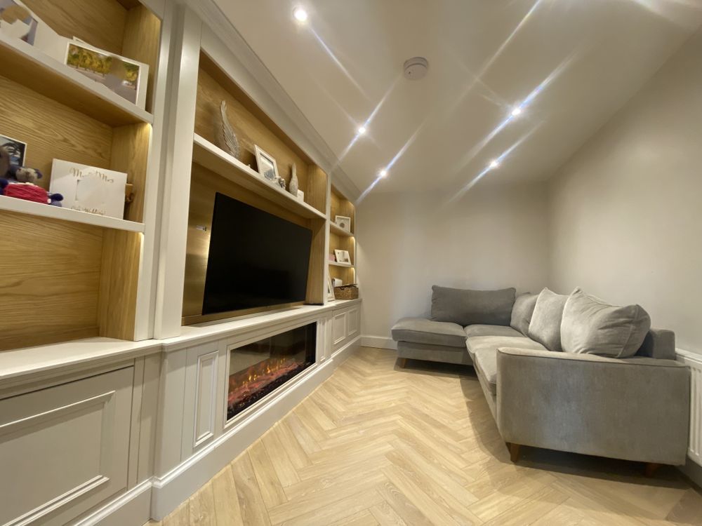 Upon entering the property, you are welcomed by a bright hallway featuring elegant wall panelling and premium herringbone flooring that flows seamlessly through the ground floor. This leads into a spacious, warm and inviting living room, complete with custom built-in shelving, integrated media unit, and a feature electric fireplace — creating the perfect space for relaxing or entertaining.