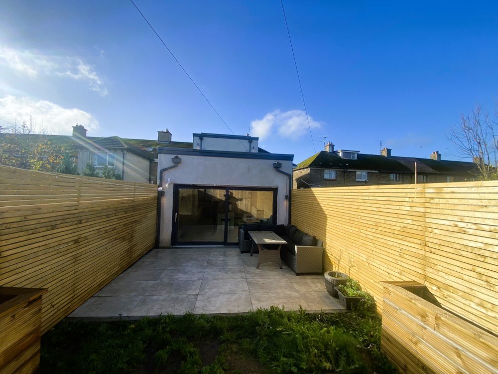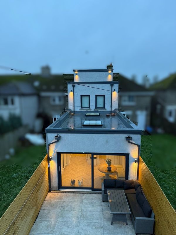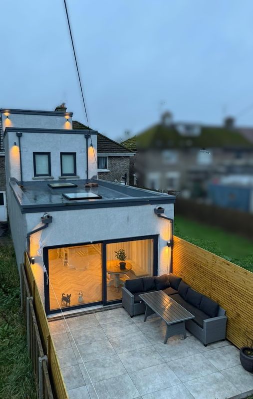Externally, the property is just as impressive. The private rear garden features modern boundary fencing, integrated outdoor lighting, a large tiled patio, and a comfortable seating area — perfect for summer evenings. The flat roof design includes multiple skylights, contributing to the naturally bright interior below.