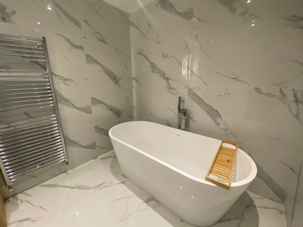 The contemporary family bathroom offers a spa-like feel, finished with large-format marble-effect tiles, a freestanding bathtub, separate walk-in shower, illuminated vanity mirror, dual sinks, and a heated chrome towel rail — creating a luxurious retreat.