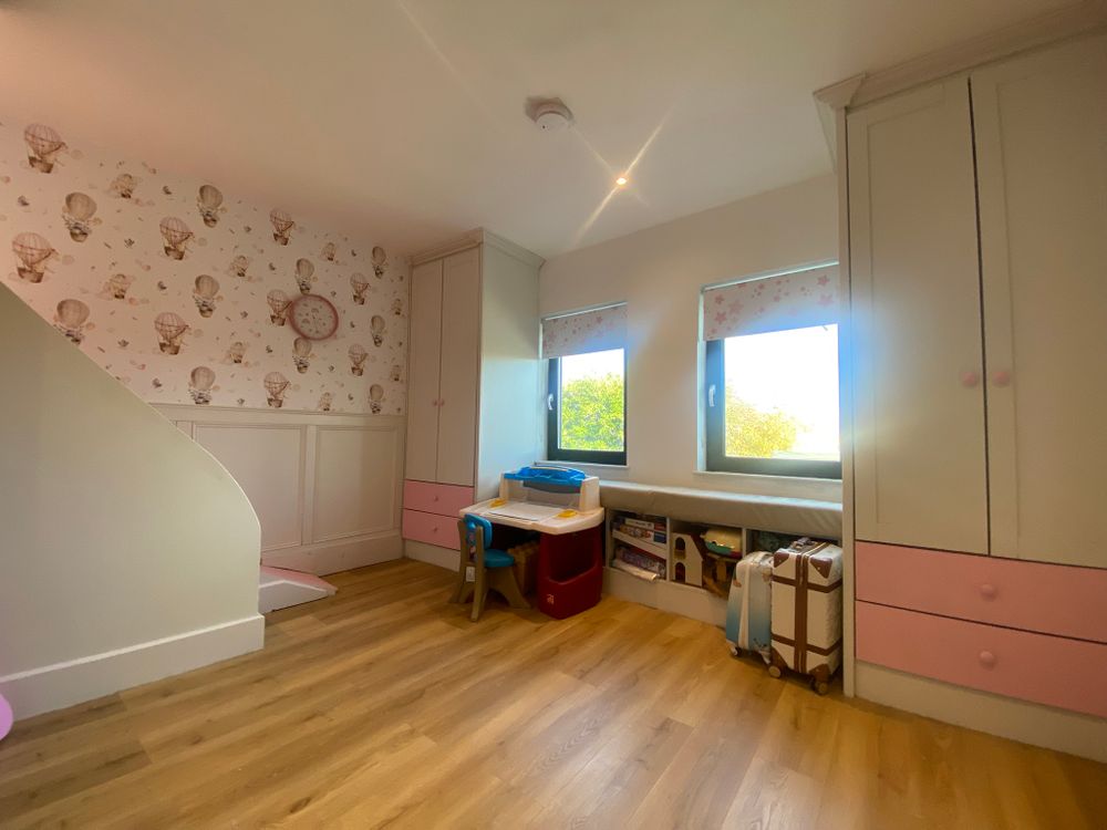 Upstairs, the accommodation includes two generous bedrooms, with one of the rooms being uniquely customised with a built-in bunk/play structure featuring shelving, a cosy sleeping area, and even a slide — a playful and practical design that maximises floor space.
