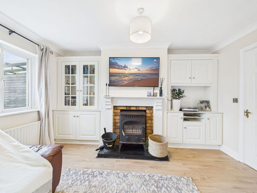 Sitting room 4.74m x 4.07m (15' 7" x 13' 4") Timber floor, fitted curtains, light fitting, coved ceiling, feature fireplace with solid fuel stove, built-in units, dimmer switch lighting, feature patio door, double doors to kitchen/dining.