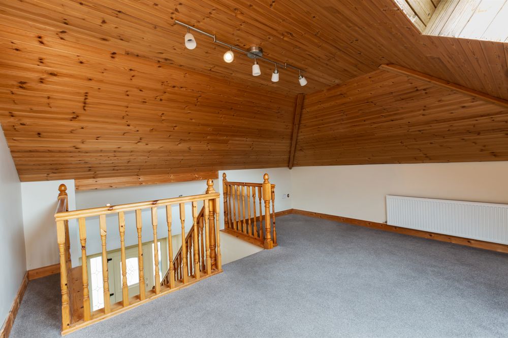 Landing / attic area two with good storage space, attractive vaulted timber ceiling, carpet to floor, ceiling downlighters.