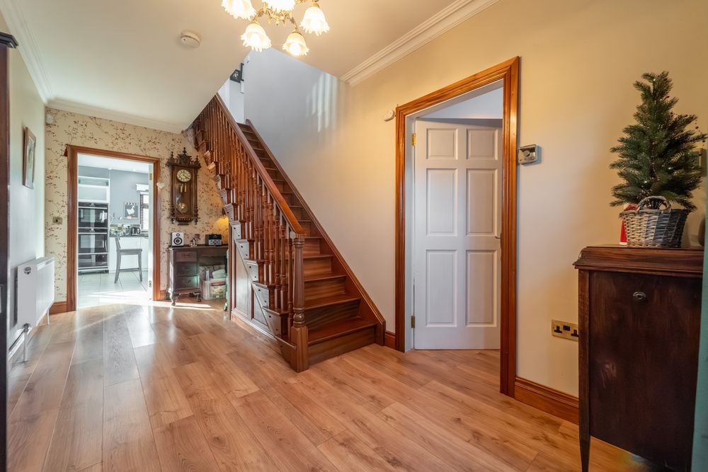 Inside, the warm and timeless character of the home is immediately evident, introduced by a stunning bespoke locally crafted mahogany staircase. The ground floor layout is generously proportioned with family living in mind, while the first floor offers spacious bedrooms off a bright, airy landing. The property blends classic and contemporary touches seamlessly.