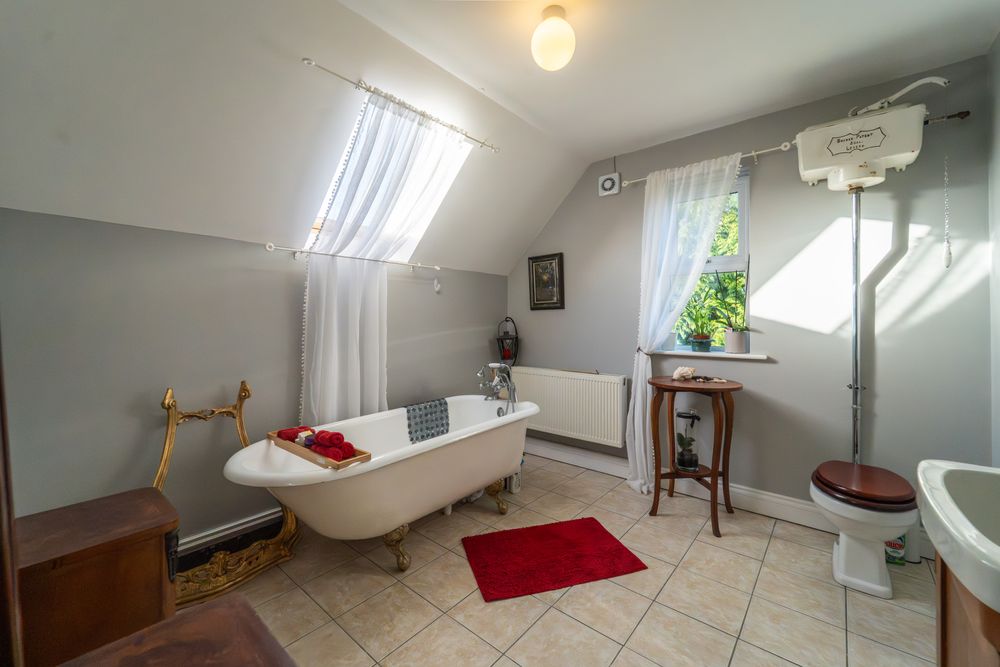 A bright and spacious family bathroom featuring, Two windows (one Velux, one standard) providing superb natural light, Tiled flooring, Beautiful stand-alone bath with classic Westminster-style caps, Stand-alone sink with vanity unit, mirror, and overhead lighting, A unique, a period-style pull-chain toilet, adding authentic old-world charm