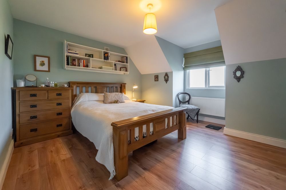 Positioned at the front of the house, this large double bedroom is currently arranged as a cosy reading room. Its flexibility makes it suitable as a bedroom, study, or hobby space.