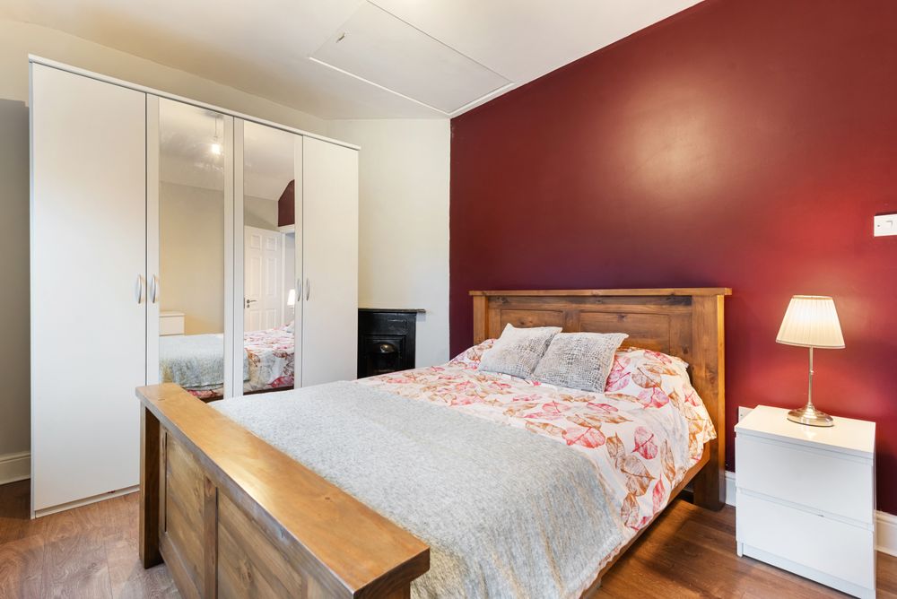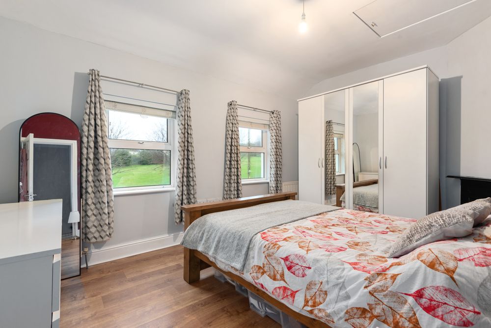 The main bedroom is a bright double room with dual-aspect windows overlooking the front garden and adjacent green area. This room retains an original feature fireplace, laminate wood flooring and high ceilings.