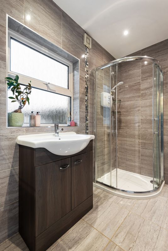 The bathroom is fully tiled from floor to ceiling and comprises a corner shower with electric Triton shower, WC, wash hand basin with vanity unit, chrome radiator, wall mirror, ceiling downlights and built-in shelving.