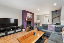 The living/dining room is a particularly inviting space, filled with natural light from dual-aspect windows. It features a fireplace with multi-fuel stove, laminate wood flooring, TV point, and a door providing access to the side garden. There is also practical under-stairs storage.