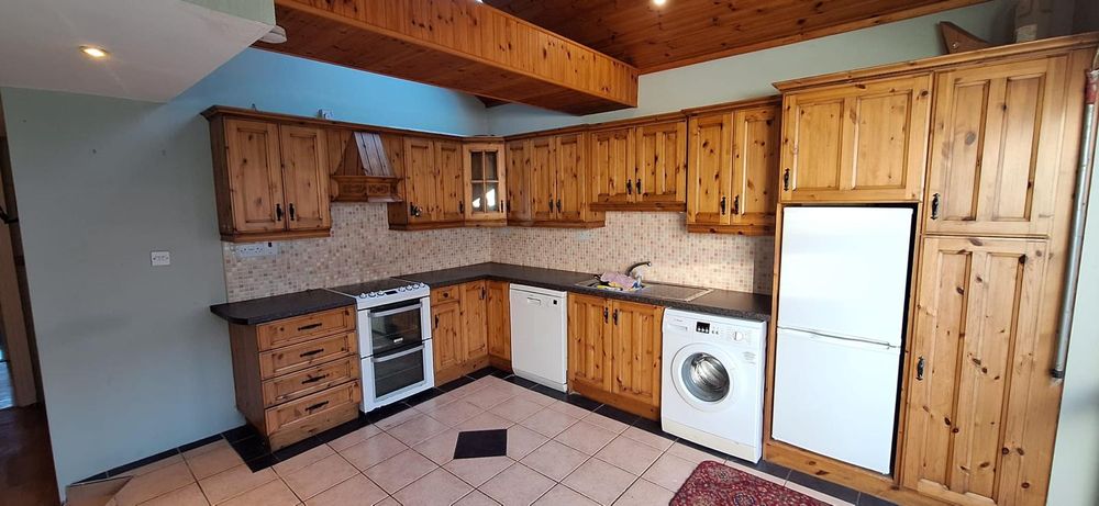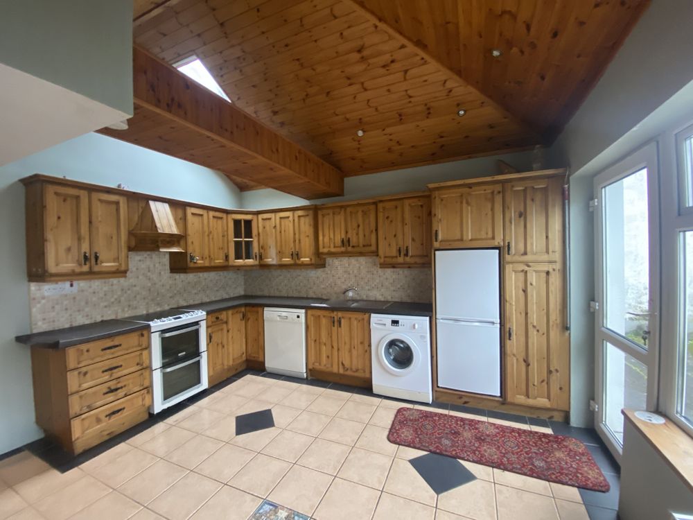 The kitchen is rich in character, featuring a wood-panelled ceiling and a Velux window that allows natural light to flood the space. Oil-fired central heating serves the property, complemented by the multiple solid fuel stoves throughout.
