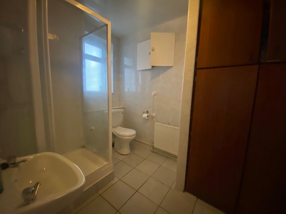 Ceramic tiled flooring, corner shower unit, white sanitary ware, light fitting.