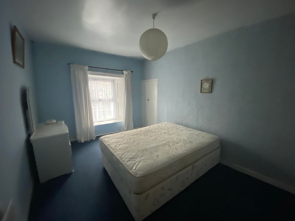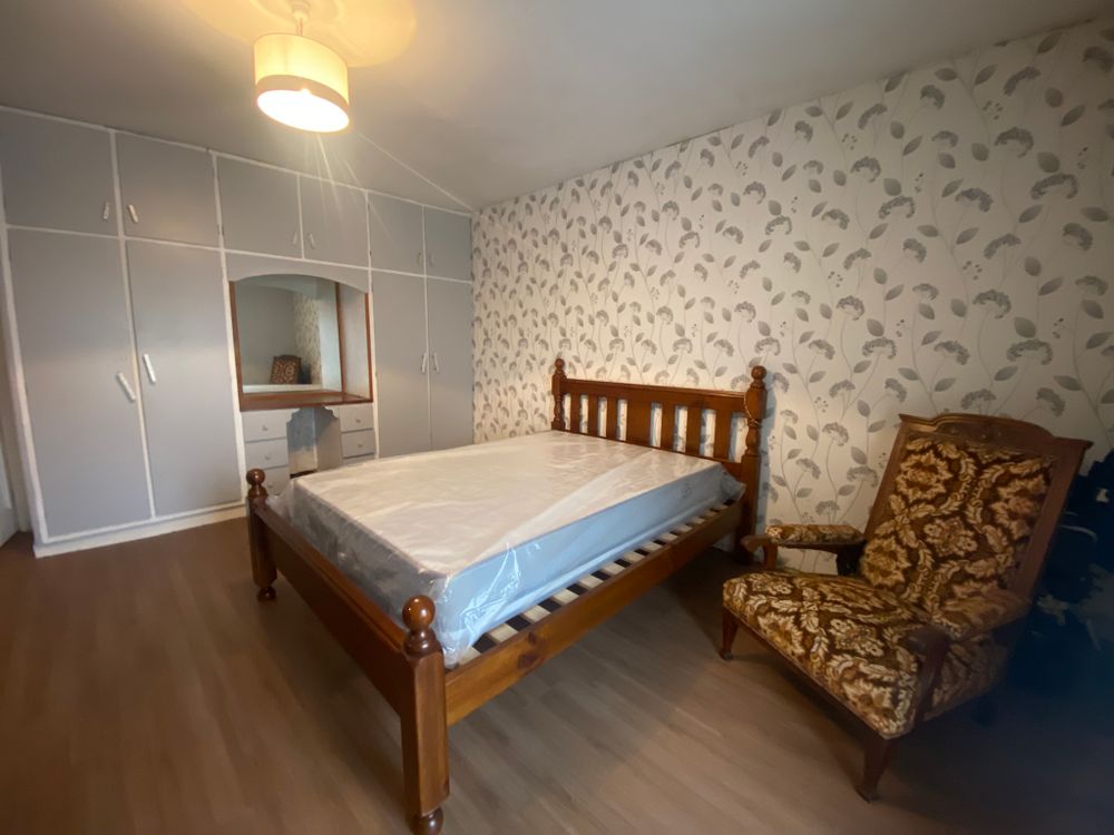 Double bedroom with carpeted flooring, light fitting , built in wardrobes, curtain pole.