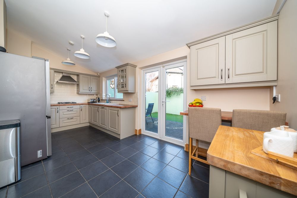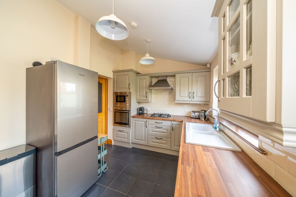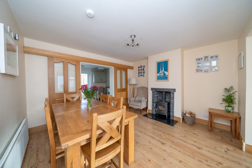 This stunning property features bi folding electric gates leading a to a large driveway and an attractive facade with external insulation, a new front door and windows. The entrance hall boasts laminate floors which continue to a light filled open plan living room & dining area. The charming living space enjoys a feature fireplace and alcove storage while the dining area comes with a solid fuel stove and double doors to the kitchen extension. The high spec L shaped kitchen has plenty of counter & cupboard space, a tiled floor, splashback tiling and a breakfast bar. The downstairs accommodation is completed by a utility room with built in storage, a combi boiler and a guest w.c. French doors from the kitchen open to the sunny cobblelock courtyard which is the perfect place to relax. Upstairs consists of three bedrooms and the family bathroom. The generous sized bathroom is fully tiled and has a separate bath & shower, an electric shower and a towel radiator. The back double bedroom has sophisticated fitted wardrobes, an ornate fireplace and laminate floors. The main bedroom to the front of the property also has ample fitted wardrobes, an ornate fireplace and laminate floors. The third bedroom enjoys built in storage and laminate floors. The landing provides access to the floored attic via a Stira.