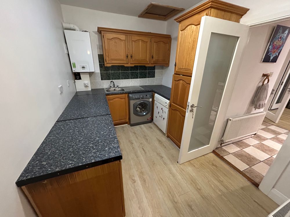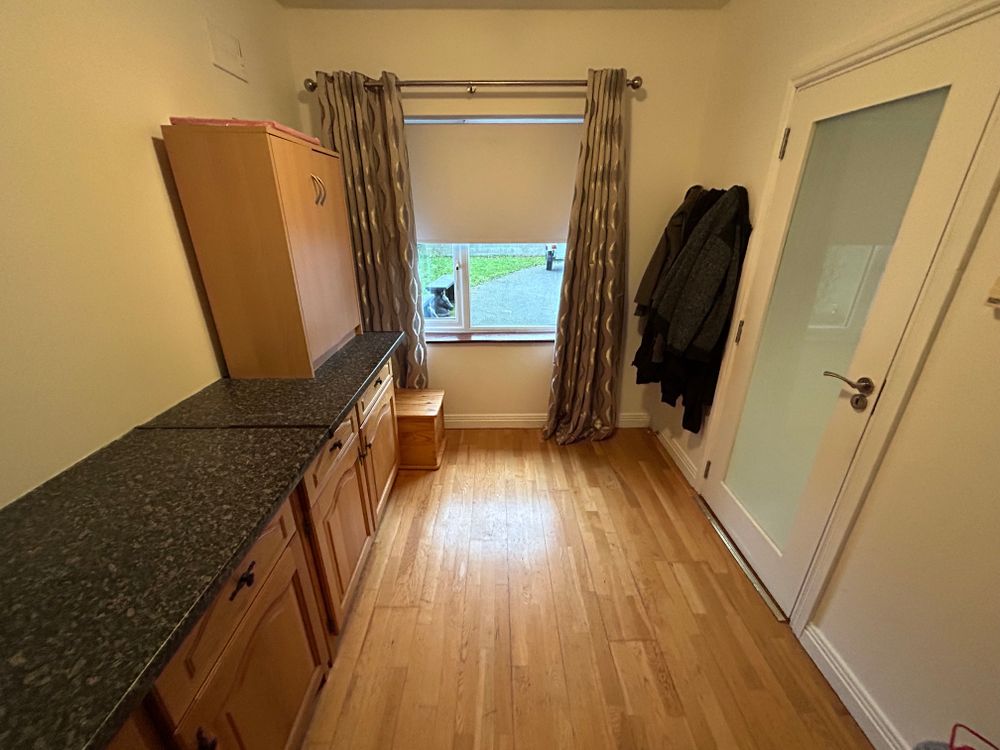 Kitchen Area: Finished with a tiled floor, the kitchen is fitted with an attractive L-shaped solid timber kitchen. Appliances include a Whirlpool gas hob, a Belling integrated double oven, provision for an integrated microwave, a stainless steel sink, and plumbing for a dishwasher. A movable island unit provides additional workspace and flexibility.