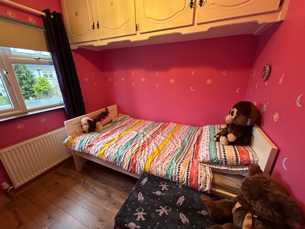 A single bedroom, suitable for use as a bedroom, nursery, or home office. The room is finished with a laminate floor and includes wall-mounted storage.