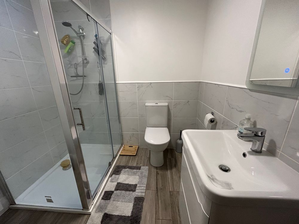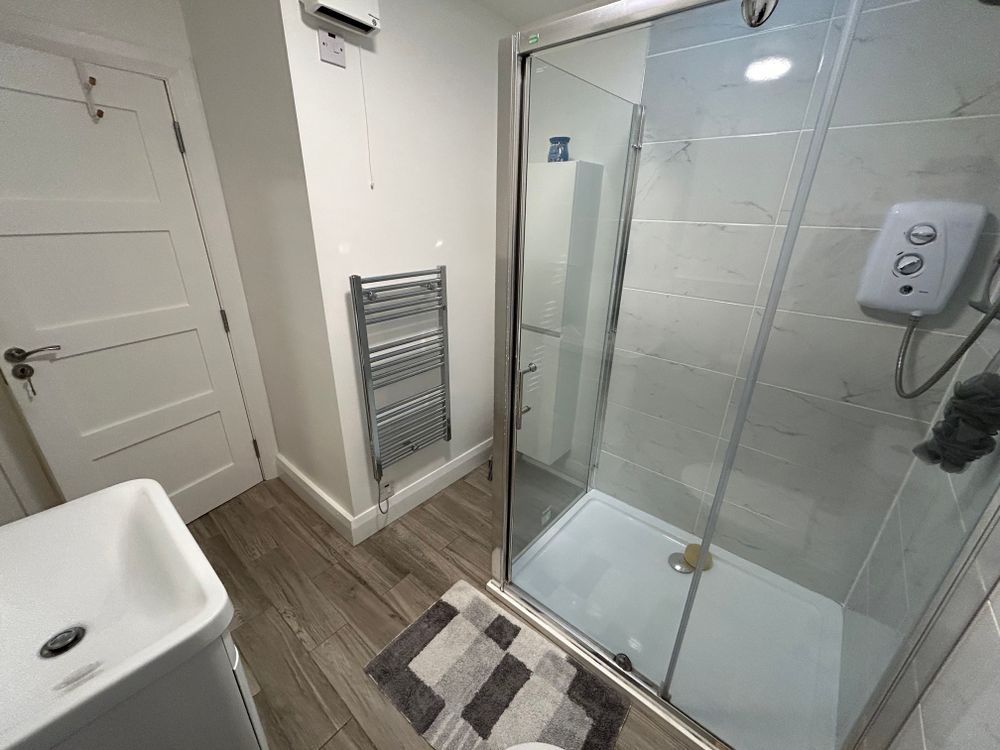 The en suite has been fully modernised and is finished to a high standard. It includes a shower enclosure with a Triton T90 electric shower, modern tiling to the walls and floor, a contemporary WC and wash-hand basin, and a large mirror.